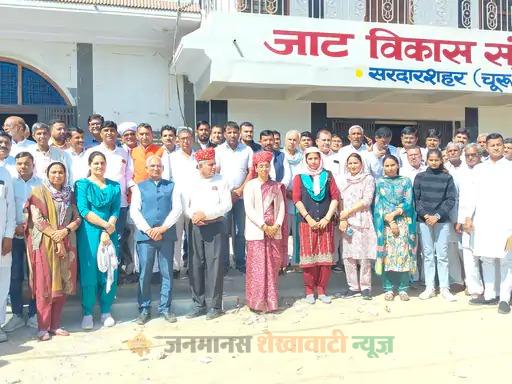 सरदारशहर : सरदारशहर में जाट विकास संस्थान के सभागार हॉल में रविवार को बैठक हुई। रेवतराम बेनीवाल की अध्यक्षता में नई कार्यकारिणी का गठन किया गया। एडवोकेट महेंद्र सिंवर के नेतृत्व में 11 सदस्यीय कमेटी बनाई गई। कमेटी के सदस्यों ने सर्वसम्मति से दौलतराम सारण को अध्यक्ष और रेणुका चौधरी को महिला शाखा की अध्यक्ष चुना। दोनों पदाधिकारियों का माला और साफा पहनाकर स्वागत किया गया।