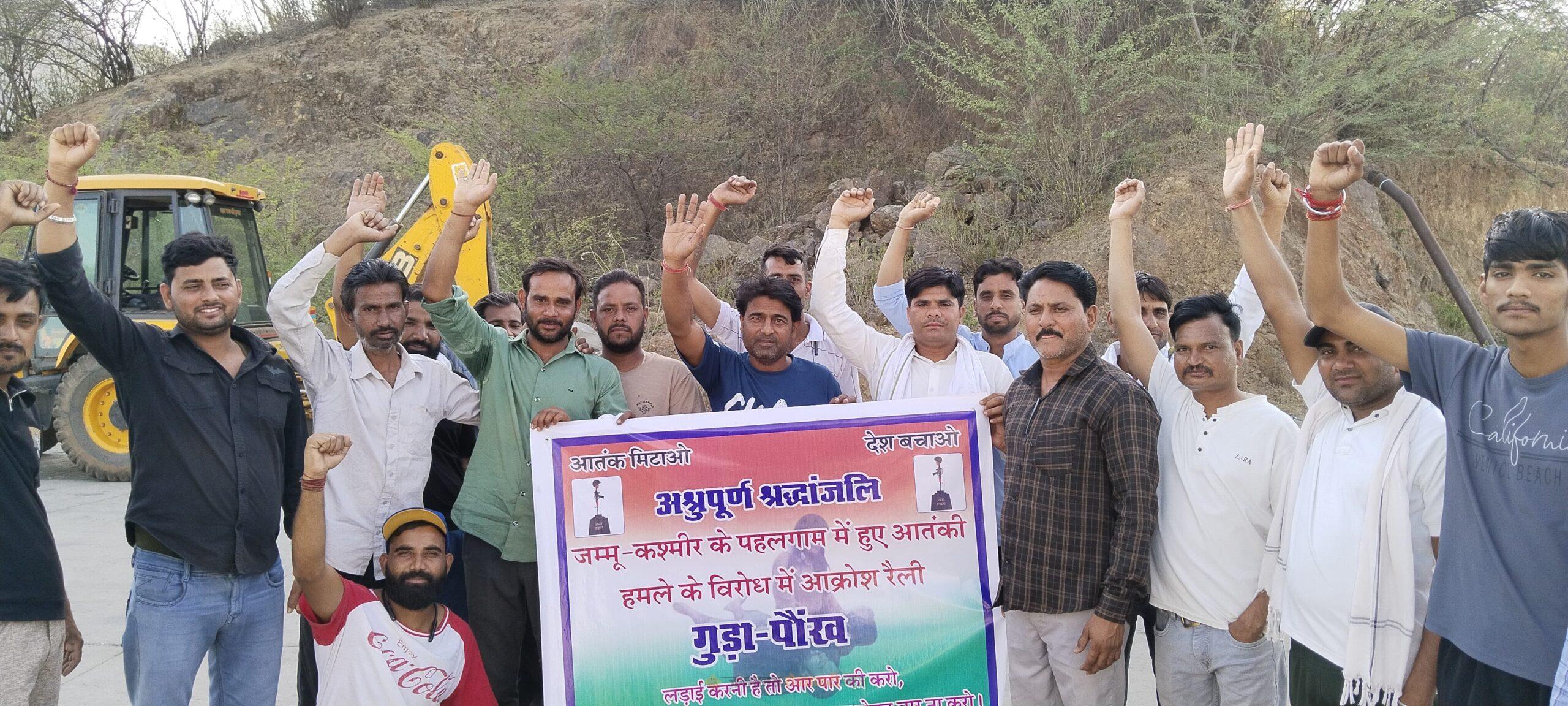 गुढ़ागौड़जी : गुड़ा ग्राम पंचायत के भैरूजी बस स्टैंड पर ग्रामीणों ने एकजुट होकर जोरदार विरोध प्रदर्शन किया। इस विरोध प्रदर्शन का नेतृत्व उप प्रधान प्रतिनिधि महिपाल सिंह एवं सामाजिक कार्यकर्ता ब्रह्मदत्त मीणा गुड़ा ने किया। प्रदर्शन के दौरान ग्रामीणों ने आतंकवाद के खिलाफ नारेबाजी की और केंद्र सरकार से आतंकियों के खिलाफ कठोर कार्रवाई की मांग की। उपस्थित जनसमूह ने शहीद हुए सुरक्षाकर्मियों को श्रद्धांजलि अर्पित करते हुए दो मिनट का मौन भी रखा।