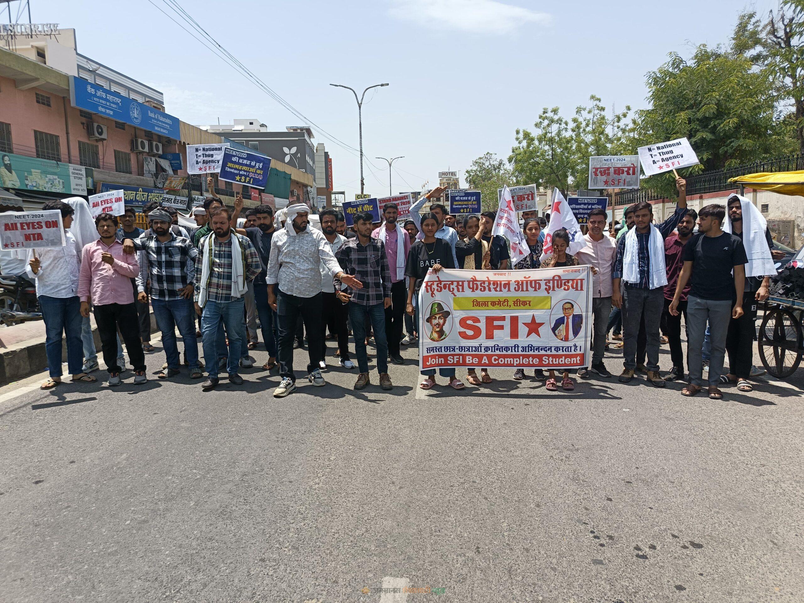 सीकर : नीट परीक्षा 2024 में धांधली और भ्रष्टाचार का आरोप लगाते हुए आज छात्र संगठन स्टूडेंट फेडरेशन ऑफ इंडिया के द्वारा सीकर में विरोध जताया गया। एसएफआई विधानसभा अध्यक्ष यश सोनी ने बताया सैकड़ों स्टूडेंट रैली के रूप में ढाका भवन से कलेक्ट्रेट परिसर पहुंचे। इस दौरान उन्होंने जमकर नारेबाजी भी की। जिनका कहना है कि इस परीक्षा को ही रद्द करना चाहिए। वहीं एबीवीपी और एनएसयूआई ने भी अपना विरोध जताया।