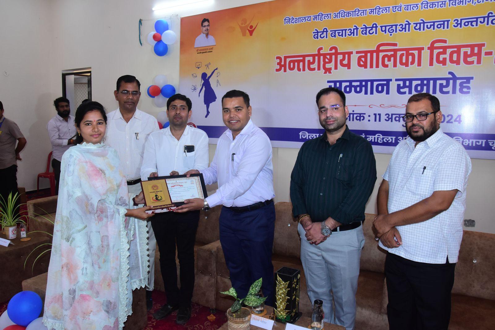 चूरू : अंतरराष्ट्रीय बालिका दिवस के उपलक्ष्य में शुक्रवार को जिला मुख्यालय स्थित ओंकार वाटिका में महिला अधिकारिता विभाग की ओर से आयोजित कार्यक्रम में विभिन्न क्षेत्रों में उत्कृष्ट उपलब्धियों के लिए बालिकाओं एवं महिलाओं का सम्मान किया गया।