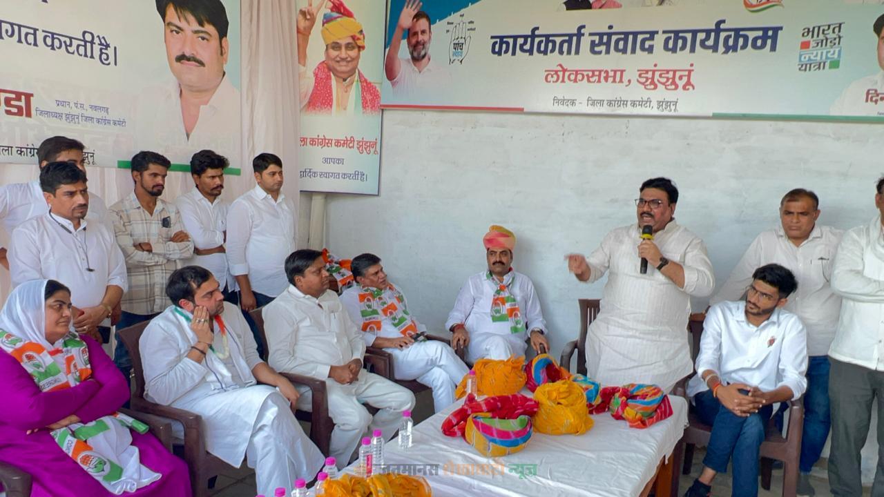 झुंझुनूं : जिला मुख्यालय स्थित जिला कांग्रेस कमेटी कार्यालय में उपचुनाव को लेकर कार्यकर्ता संवाद करने आये राजस्थान कांग्रेस सहप्रभारी एवं राष्ट्रीय सचिव चिरंजीव राव को मुस्लिम न्याय मंच के हजारों कार्यकर्ताओं ने झुंझुनूं विधानसभा उपचुनाव में मुस्लिम समाज को टिकट देने के लिये ज्ञापन दिया व झुंझुनूं की 30 मुस्लिम बिरादरी के आवेदन दिये। उक्त कार्यक्रम में राजस्थान मदरसा बोर्ड के चैयरमेन एम.डी. चोपदार ने कार्यक्रम को संबोधित करते हुये कहा कि आजादी से लेकर आज तक झुंझुनूं विधानसभा में कांग्रेस पार्टी ने कभी भी मुस्लिम समुदाय को विधानसभा का टिकट नहीं दिया। उन्होंने कहा कि पूरे राजस्थान में मुस्लिम समुदाय सौ प्रतिशत कांग्रेस को वोट देता है। उन्होंने ये भी याद दिलाया कि झुन्झुनूं लोकसभा से मुस्लिम समुदाय के कैप्टन अयूब साहब दो बार सांसद बने है।