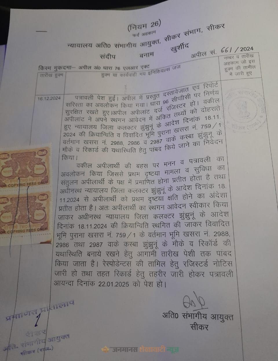 झुंझुनूं : न्यायालय जिला कलेक्टर के एक फैसले के बाद जिला मुख्यालय के वार्ड नंबर 17 रोड नंबर तीन की तीन बीघा 6 बिस्वा जमीन को लेकर डेढ दर्जन से अधिक लोगों पर आए संकट को एक बार के लिए अंतरिम राहत मिल गई है। सोमवार को अतिरिक्त संभागीय आयुक्त न्यायालय सीकर ने संदीप मांजू की ओर से की गई अपील को स्वीकार करते हुए 18 नवंबर 2024 को न्यायालय जिला कलेक्टर झुंझुनूं के आदेश की क्रियान्विति को स्थगित करते हुए स्टे दिया है। वहीं अपने आदेशों में न्यायालय ने कहा है कि अपीलार्थी की बहस पर मनन और पत्रावली का अवलोकन करने के बाद प्रथम दृष्टया मामला व सुविधा का संतुलन अपीलार्थी के पक्ष में प्रमाणित होना प्रतीत होता है। अधीनस्थ न्यायालय जिला कलेक्टर झुंझुनूं के आदेश से अपीलार्थी को प्रथम दृष्टया क्षति होने का भी अंदेशा प्रतीत होता है। इसलिए अपीलार्थी का स्थगन आवेदन स्वीकार किया जाकर अधीनस्थ न्यायालय जिला कलेक्टर झुंझुनूं के आदेश की क्रियान्विति स्थगित की जाकर विवादित भूमि के वर्तमान मौके व रिकॉर्ड की यथास्थिति बनाए रखने के लिए आदेश दिए है। जिसके बाद इस क्षेत्र में छह दशक से आवासित परिवारों और लोगों ने एक बार राहत की सांस ली है। आपको बता दें कि इससे पहले रविवार को स्थानीय प्रभावित लोगों ने कोतवाली में भी एक रिपोर्ट कुछ लोगों के खिलाफ दी थी। जिन पर आरोप लगाया था कि वे जमीन पर बसे लोगों को धमकी देकर जमीन पर जबरन कब्जा करना चाह रहे है।