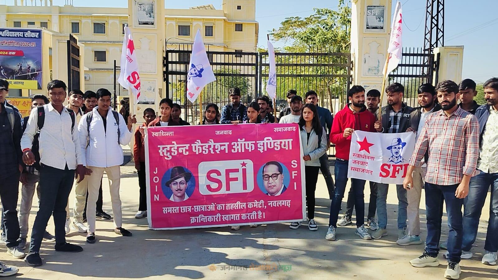 गौरव वर्मा ने बताया कि इस वर्ष फीस में अनुचित वृद्धि की गई है जो कि विद्यार्थी विरोधी है। कॉलेज कमेटी महासचिव रोशनी वर्मा ने बताया कि शेखावाटी विवि ने एग्जाम फॉर्म फीस में बढ़ोतरी कर विद्यार्थियों को नए साल में ठगना शुरू कर दिया है। संयुक्त सचिव रहीश सेवदा ने बताया कि कुलपति ने फीस बढ़ोतरी के अपने मन माने फरमान जारी किए हैं वो वापस ले, अन्यथा छात्र संघठन एसएफआई विद्यार्थियों को लामबद्ध कर उग्र आंदोलन की ओर अग्रसर होगा, जिसकी सम्पूर्ण जिम्मेदारी विश्वविद्यालय प्रशासन की होगी। इस दोरान रश्मि, राधिका, तनु, विवेक, रवि, विकास, मुजाहिद ,पुनीत, चिराग, मोहित, अभिषेक, चरण, आदित्य मीणा, लवप्रीत, सचिन, आशीष, नरेश, अंकित सहित महाविद्यालय के अनेक छात्र छात्राएं मौजूद रहे।