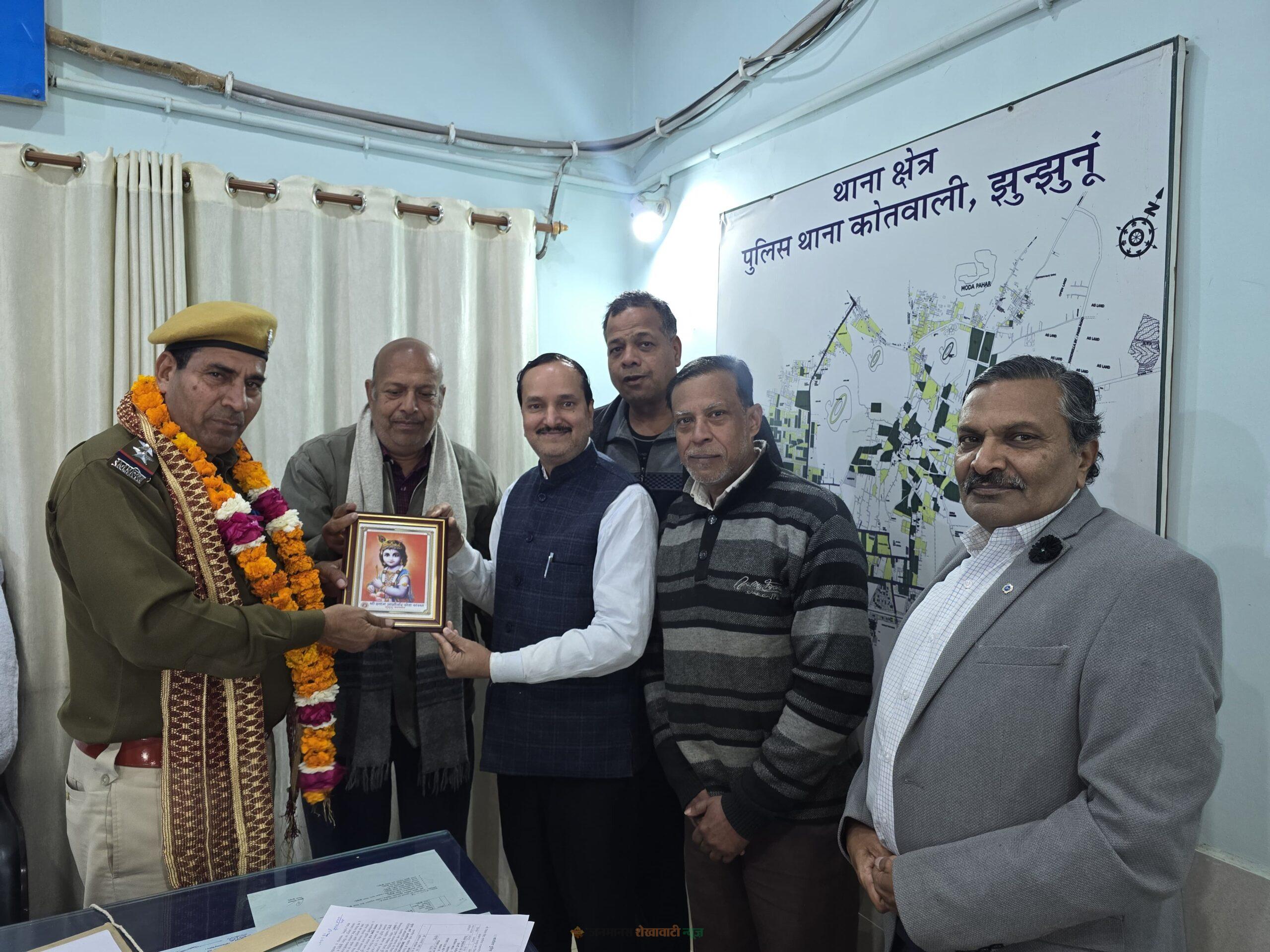 झुंझुनूं : झुंझुनूं थाना में शहर कोतवाल नवआगंतुक नारायण सिंह जो की पिलानी से स्थानांतरण होकर आए हैं से शिष्टाचार भेंट कर उनका स्वागत अभिनंदन किया। सुनील पाटोदिया वेलफेयर फाउंडेशन के प्रदीप पाटोदिया, अग्रवाल समाज अध्यक्ष सम्पत चुडैलावाला, वस्त्र व्यापार संघ के अशोक केडिया नीटू, श्री श्याम आशीर्वाद सेवा संस्था के ट्रस्टी डॉक्टर डीएन तुलस्यान एवं सुनील तुलस्यान ने शहर कोतवाल नारायण सिंह का माल्यार्पण के साथ दुपट्टा ओढाकर बाबा श्याम का प्रतीक चिन्ह भेंट कर स्वागत अभिनंदन किया। इस अवसर पर शहर कोतवाल ने बताया कि बेहतर जांच और सतर्कता से अपराधियों को सजा और पीड़ितों को न्याय दिलाना मेरी पहली प्राथमिकता होगी। पुलिस संवेदनषील, पारदर्षी और जवाबदेह प्रशासन प्रदान के लक्ष्य को ध्यान में रखते हुए पुलिस के ध्येय वाक्य आमजन में विश्वास-अपराधियों में भय शहर की जनता में साकार होगा।
