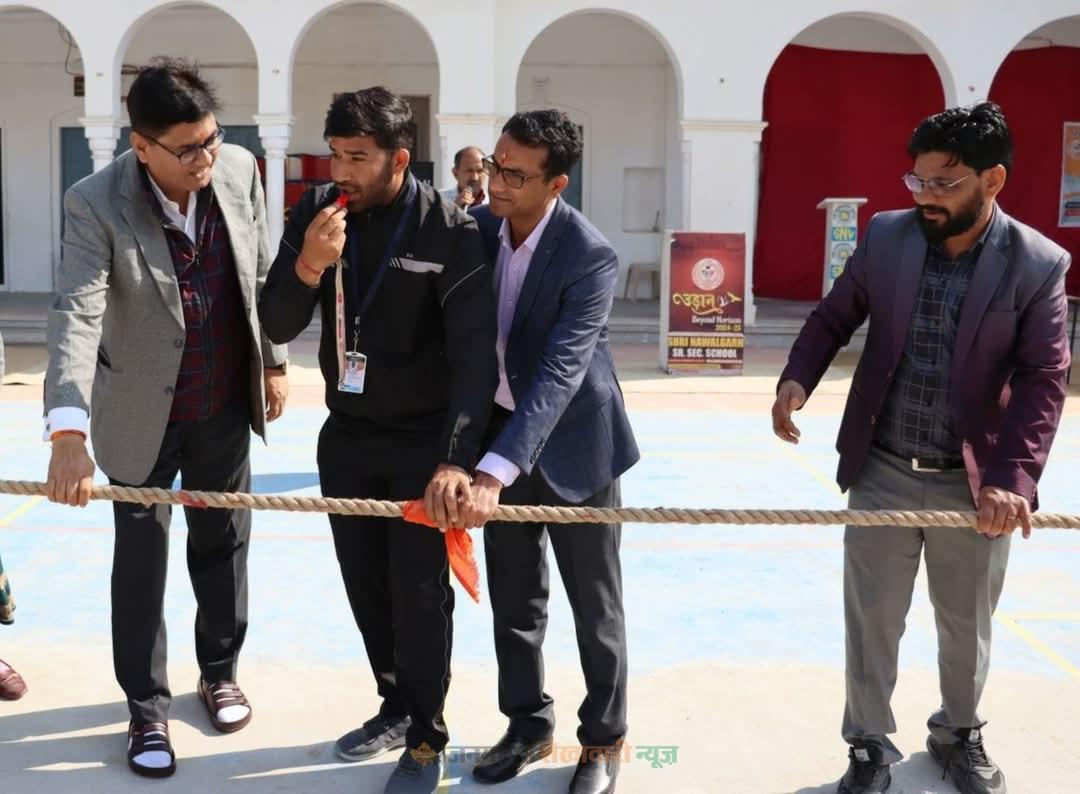 नवलगढ़ : श्री नवलगढ़ विद्यालय कमेटी, कोलकाता की ओर से कस्बे में संचालित एसएन विद्यालय में इन्टर हाउस खेलकूद प्रतियोगिता का शुभारंभ राजकीय जिला जिला अस्पताल,नवलगढ़ के पी. एम. ओ डॉ सुनील सैनी के आतिथ्य में किया गया। प्रधानाचार्य नवीन शर्मा ने मुख्य अतिथि का पुष्पमाला पहनाकर स्वागत किया। विद्यालय का परिचय देते हुए चारों सदनों ऋग्वेद, अथर्ववेद, सामवेद के बारे में जानकारी दी। विद्यालय के छात्र घनीष्ठ शर्मा व रिशिका चेजारा के मार्गदर्शन में सूर्य नमस्कार करवाया गया। खेल-कूद प्रतियागिता का विधिवत शुभारंभ मुख्य अतिथि ने मशाल जलाकर विद्यालय के कैप्टन देवाशीश कालो को थमाकर किया। छात्रा पलक जांगिड़ ने खेल-कूद कार्यक्रम की सभी छात्र-छात्राओं को शपथ ग्रहण करवाई। मुख्य अतिथि ने रस्साकशी प्रतियोगिता का पहला मैच करवाया। मुख्य अतिथि ने अपने उद्बोधन में बताया कि विद्यार्थी के सर्वांगीण विकास में खेल-कूद अति महवपूर्ण है। मुख्य अतिथि द्वारा विजेता टीम को 1100 रुपए का नकद पुरस्कार देने की घोषणा की।