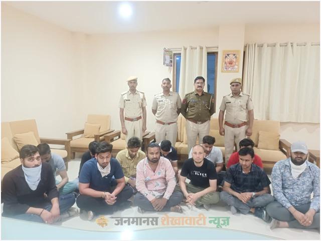 चूरू : जिला मुख्यालय पर पुलिस अधीक्षक जय यादव आई पी एस ने बताया कि अपराधो की रोकथाम, अवैध गतिविधियो की रोकथाम एवं अपराधियों की धरपकड हेतु चलाये जा रहे विशेष अभियान के तहत अति पुलिस अधीक्षक लोकेन्द्र दादरवाल एवं रामेश्वरलाल सारण आरपीएसस वृताधिकारी सरदारशहर के सुपर विजन मे थानाधिकारी सरदारशहर मदनलाल बिश्नोई पुनि नेतृत्व मे हिम्मतसिंह सउनि एवं विजेन्द्रसिंह मय टीम ने दौराने धरपकड अवैध जुआ खेलते हुये नजद रूप श्री होटल, कस्बा सरदारशहर पर गोविन्द सोनी, मुकुल सोनी, गोपाल सैन, विशाल सोनी, आदित्य सोनी, नितेश सोनी, विकास सोनी, सूर्यप्रकाश सोनी, दीपक सोनी, मोहित सोनी, सुरेश कुमार सोनी, लोकेश सोनी, को जुआ खेलते हुये को गिरफ्तार किया ओर अवैध जुआ राशी 36500 रूपये बरामद कर अभियोग धारा 13 आरपीजीओ में दर्ज किये गये। जिसमें पुलिस भुमिकाः में हिम्मतसिंह, विजेन्द्रसिंह ,रोहिताश कुमार, लीलाधर, राजेन्द्रसिंह, महेन्द्र शर्मा ,सत्यप्रकाश , शामिल रहे।
