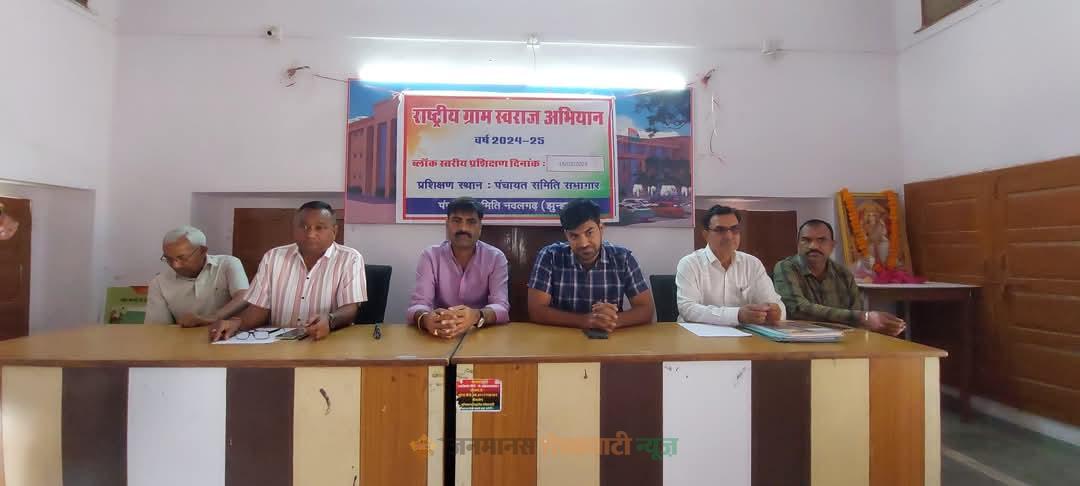 नवलगढ़ : पंचायत समिति में प्रधान दिनेश सुण्डा की अध्यक्षता में मंगलवार को राष्ट्रीय ग्राम स्वराज अभियान वर्ष 2024-25 हेतु ब्लॉक की एएनएम का एक दिवसीय ब्लॉक स्तरीय प्रशिक्षण कार्यक्रम का आयोजन किया गया। प्रशिक्षण में रितेश सांखला विकास अधिकारी, सुरेश कुमार, बलबीर सिंह ढाका, नेमीचंद, ओमप्रकाश आलडिया, बंशीधर कालेर, सहायक विकास अधिकारी,राधाकृष्ण सुंडा पीईओ, अनुराग कनिष्ठ सहायक, सुनील कुमार आरजीएसए आदि उपस्थित रहे।