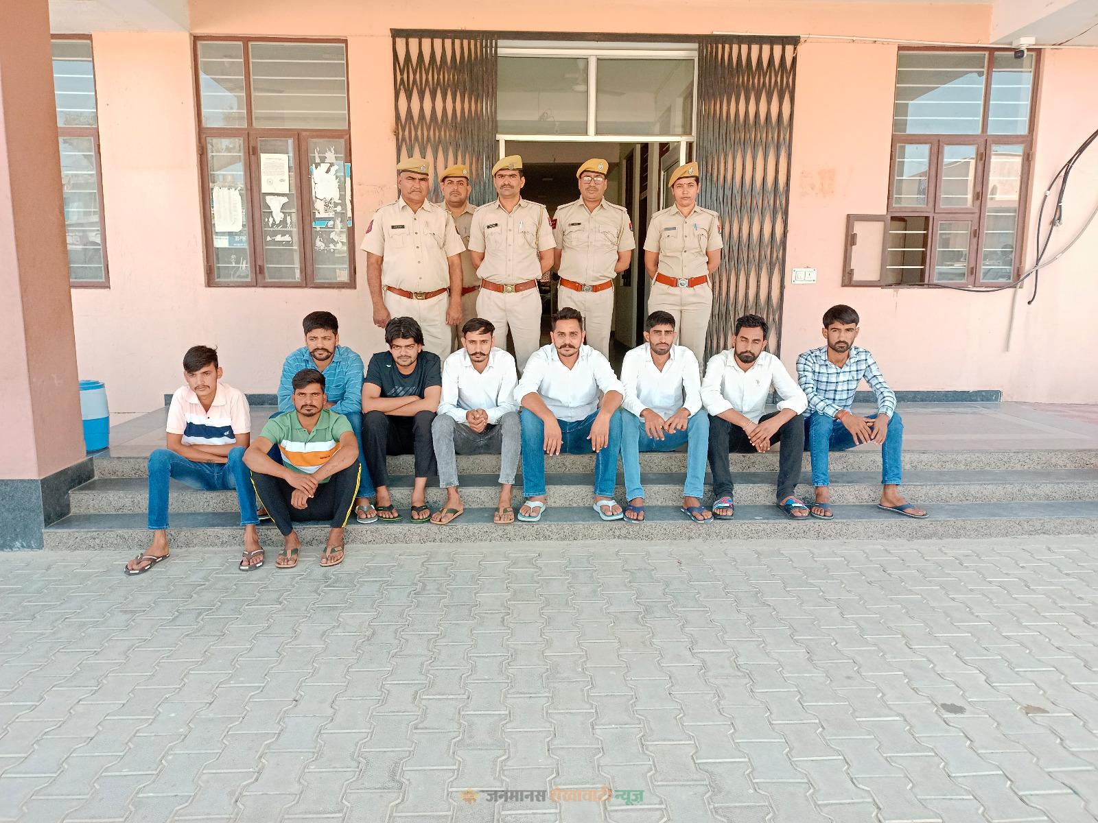 पुलिस ने मामले में वीरेंद्र सिंह उर्फ गोलू (21), निवासी सीथल, धर्मेंद्र उर्फ धर्मा जाखड़ (30), निवासी सुनारी, रोहिताश कुमार (23), निवासी मालिकों की ढाणी, अनिल कुमार (23), निवासी गढ़ला कला, अरविंद कुमार (23), निवासी देलसर, रोहित कुमार (21), निवासी भौड़की, सूरज कुमार (20), निवासी जीतरवाल की ढाणी, विकास कुमार उर्फ फौजी (30), निवासी जाखल और विनोद कुमार (27), निवासी जीतरवालो की ढाणी को जांच के बाद गिरफ्तार कर लिया।