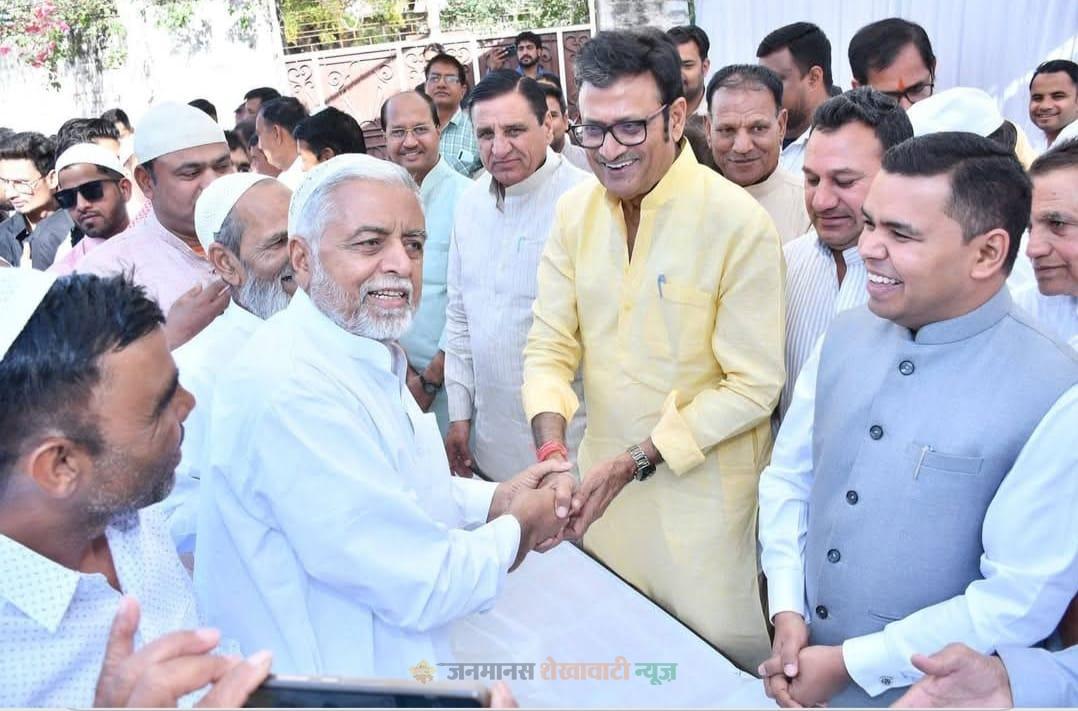 ईदगाह के मुख्य गेट पर पूर्व मंत्री भाजपा नेता राजेन्द्र सिंह राठौड़, विधायक हरलाल सहारण, प्रधान दीपचंद राहड़, जिला अध्यक्ष बसंत शर्मा, विक्रम सिंह कोटवाद, जिला कलेक्टर अभिषेक सुराणा, जिला पुलिस अधीक्षक जय यादव, उपखण्ड अधिकारी, पूर्व सभापति गोविन्द महांसरिया, चांद मोहम्मद छींपा, पूर्व प्रधान रणजीत सातडा, रियाजत अली खान, मौहम्मद हुसैन निर्माण, जिला कांग्रेस उपाध्यक्ष जमील चौहान, शहर अध्यक्ष असलम खोखर, भाजपा नेता अनवर थीम,अख्तर अली खान, बाबू ट्रेलर,हाजी शरीफ सोलंकी, किशोर धांधू, असलम खान दिलावर खानी,रामचंद्र सुंधा, पार्षद विनोद खटीक, बजरंग बजाड़, विमल शर्मा, शिव कुमार शर्मा, डॉ एफ एच गोरी, नासिर खान एडवोकेट, जिला प्रशासन के अधिकारीगण, पत्रकारगण और 36 कॉम के व्यक्तियों ने गले मिलकर ईद की मुबारक बाद दी । बड़े ही उल्लास और खुशी के साथ ईद का त्यौहार एक दूसरे को गले मिलकर मुबारकबाद देकर मनाया गया।