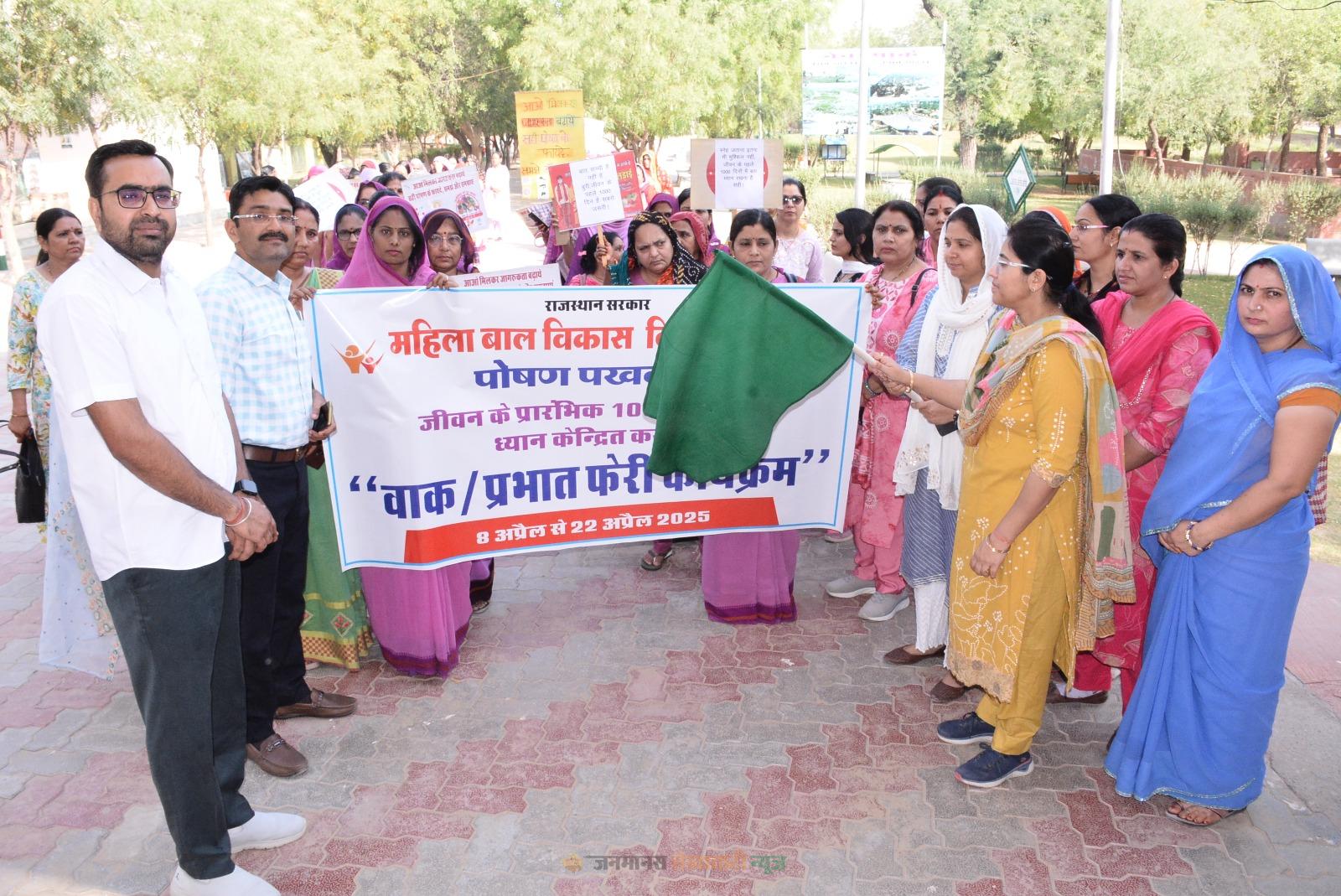 चूरू : महिला एवं बाल विकास विभाग द्वारा चल रहे पोषण पखवाड़ा कार्यक्रम का मंगलवार को उद्घाटन कार्यक्रम आयोजित किया गया। जिला प्रमुख वंदना आर्य व सीईओ श्वेता कोचर ने जिला मुख्यालय स्थित नेचर पार्क में प्रभात फेरी को हरी झंडी दिखाकर रवाना करते हुए कार्यक्रम का उद्घाटन किया।