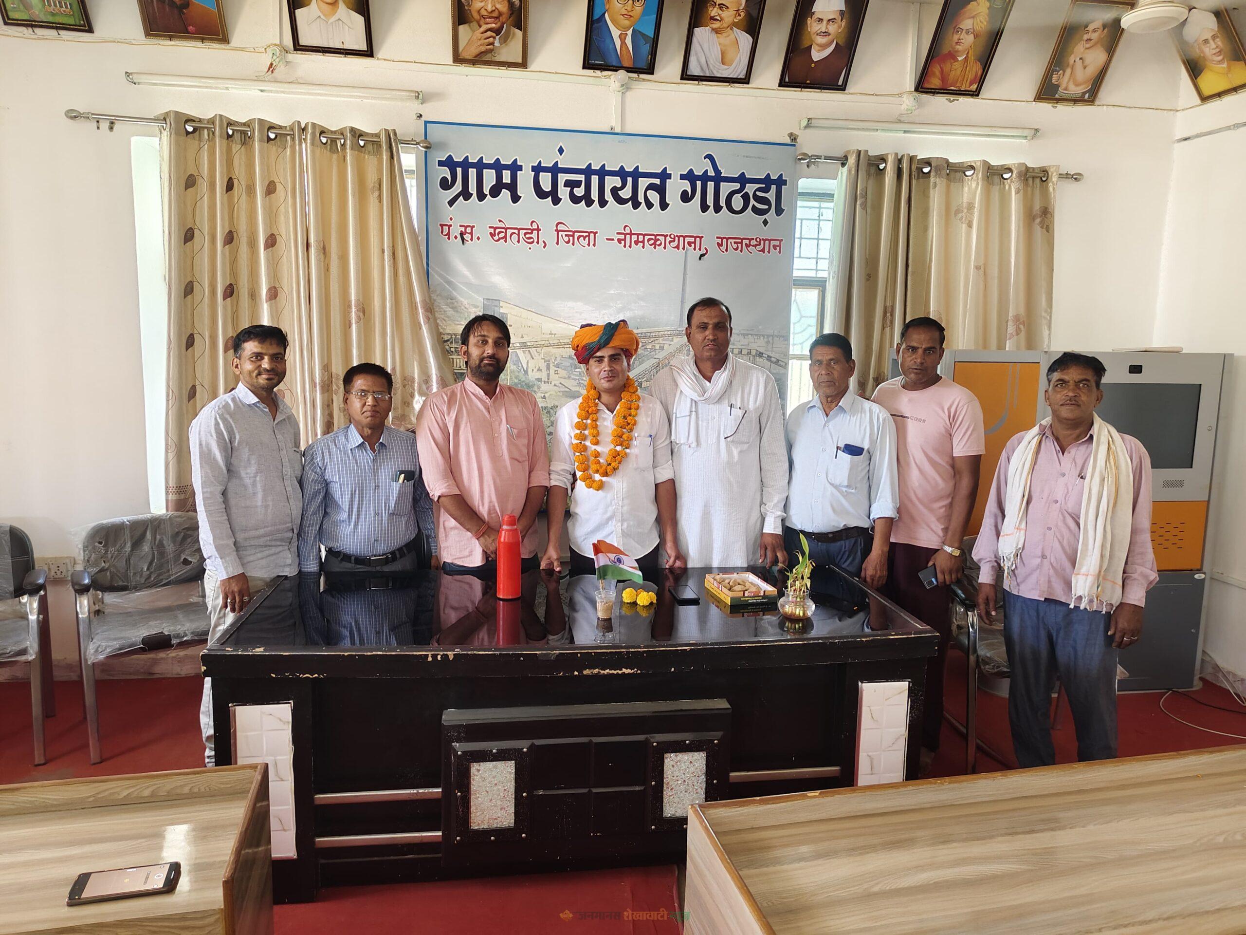 खेतड़ी नगर : गोठड़ा ग्राम पंचायत कार्यालय में गिरदावर के पद पर पदौन्नत होने वाले विकाश का गोठड़ा ग्राम पंचायत की तरफ से सम्मान किया गया। कार्यक्रम की अध्यक्षता समाज सेवी हरीराम गुर्जर ने की। ग्राम विकास अधिकारी विरेंद्र गुर्जर ने बताया कि गोठड़ा ग्राम पंचायत के पटवारी पद पर कार्यरत विकाश कुमार गिरदावर पद के लिए प्रमोशन हुआ है। समाज सेवी हरीराम गुर्जर के नेतृत्व में गोठड़ा ग्राम पंचायत के ग्रामीणों ने विकाश कुमार को साफा व माला पहना कर सम्मान किया। इस मौके पर विजेंद्र कुमार, मुलचंद मेघवाल, राजकुमार, कुलदीप शर्मा आदि ने माला पहना कर सम्मान किया।