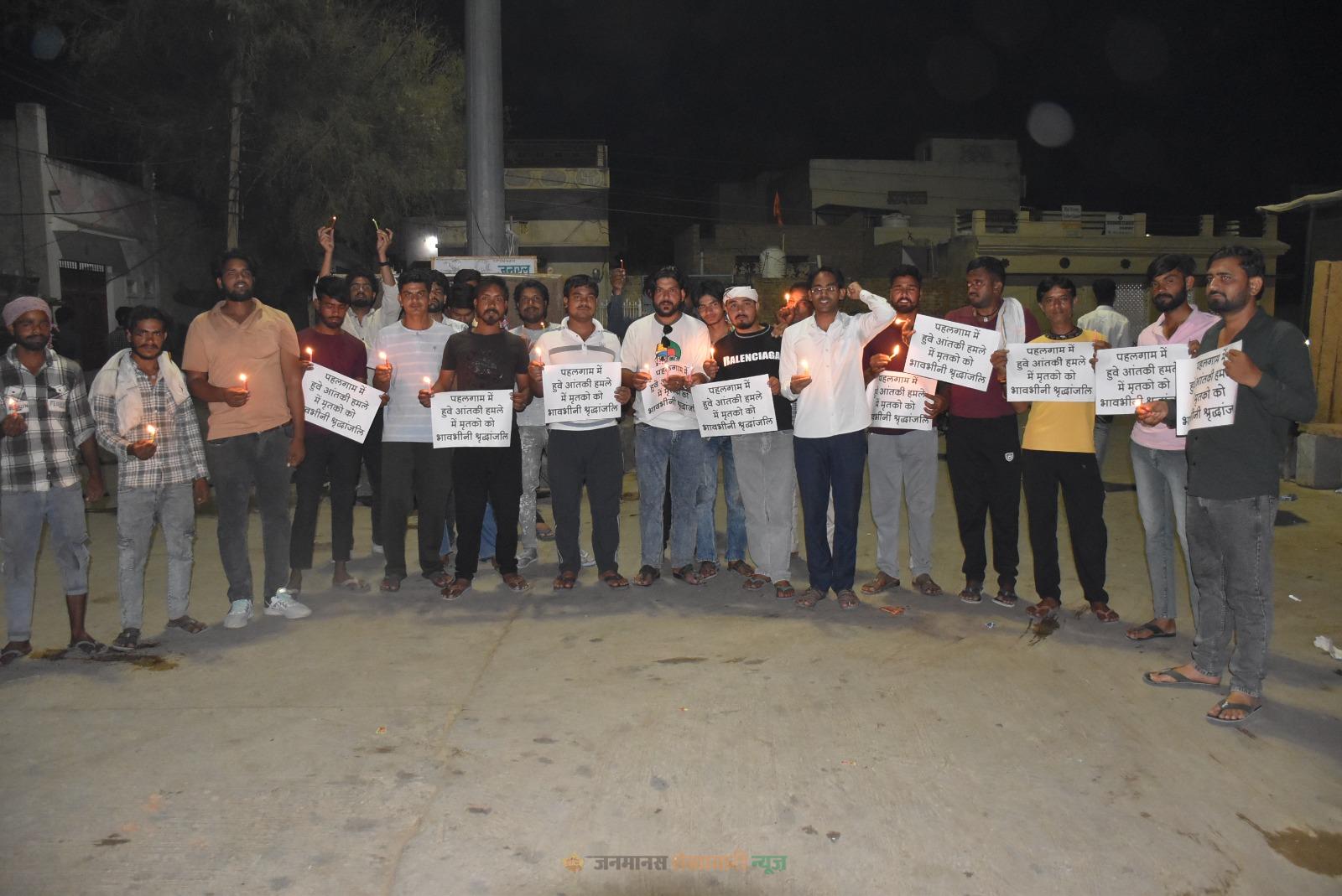 चूरू : जिला मुख्यालय पर जम्मू-कश्मीर के पहलगाम में हुए कायराना आतंकवादी हमले में मृतकों को चांदनी चौक में कैंडल मार्च निकालकर भावभीनी श्रद्धांजलि दी गई तथा शोकाकुल परिवारों के प्रति गहरी संवेदनाएं व घायलों के शीघ्र स्वास्थ्य लाभ की कामना की गई व केन्द्र सरकार से पाकिस्तान व आतंकवादियों के खिलाफ सख्त से सख्त कार्रवाई करने तथा पाकिस्तान व आतंकवादियों को मुंह तोड जवाब देने की मांग की गई।