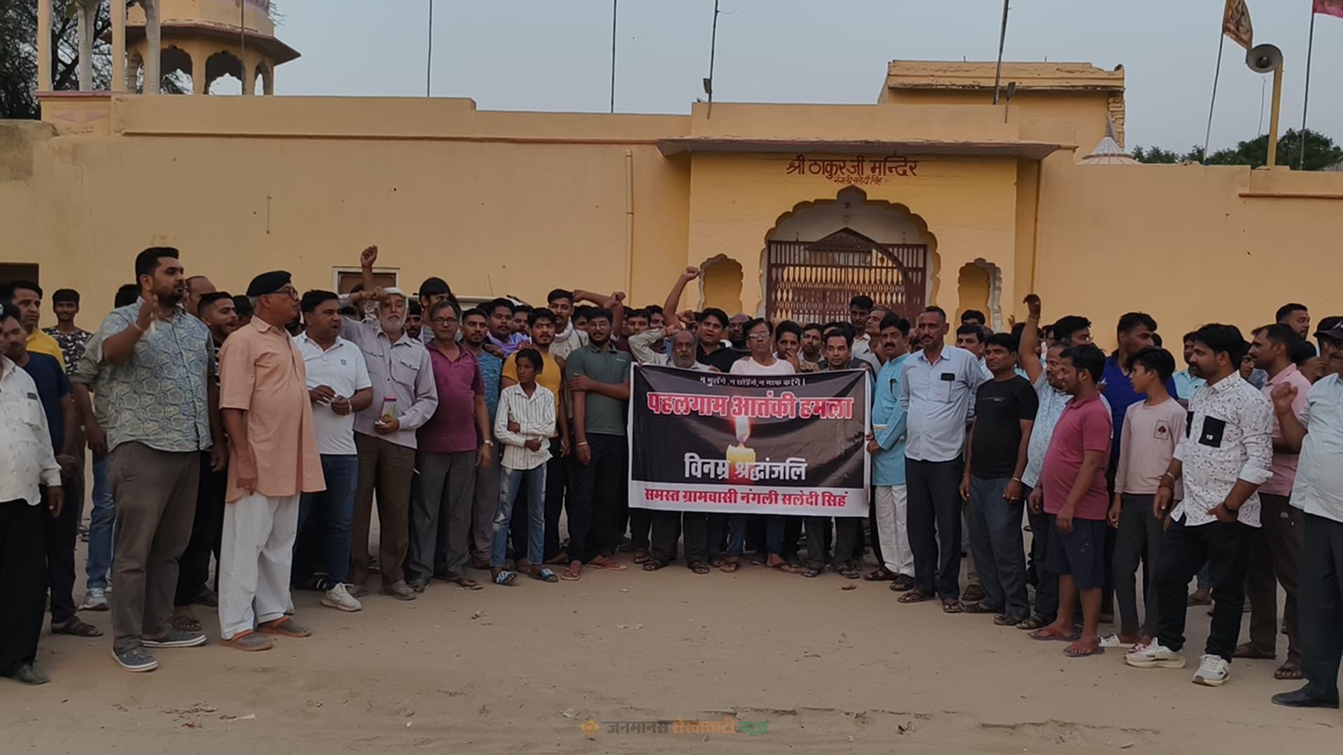 खेतड़ी : खेतड़ी उपखंड के नंगली सलेदीसिंह में पहलगाम आतंकी हमले को लेकर लोगों में खासा आक्रोश देखने को मिला मंगलवार को ग्रामीणों ने पहलगाम आतंकी हमले में मारे गए शहीदों को श्रद्धांजलि अर्पित करते हुए संपूर्ण गांव में कैंडल मार्च निकाला। नागरिकों में पाकिस्तान के प्रति खासा गुस्सा देखने को मिला। रैली में शामिल उत्साहित युवाओं और नागरिकों ने “हिन्दुस्तान जिंदाबाद” और “पाकिस्तान मुर्दाबाद” के नारे लगाते हुए पूरे कस्बे को गुंजायमान कर अपना आक्रोश जताया। ग्रामीणों ने बताया कि अब वो भारत नहीं है यह 21वी सदी का भारत है मुहतोड़ जवाब देंगे। ओर बदला लेकर रहेंगे।