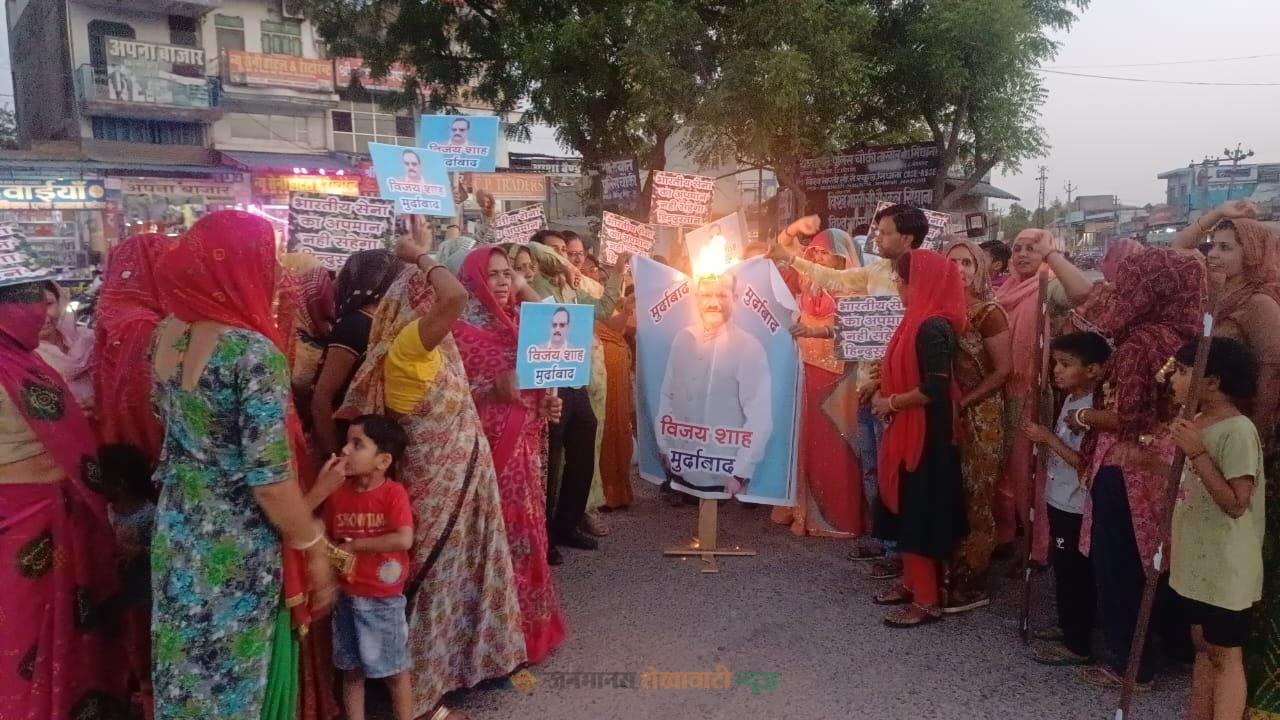 सिंघाना :मध्यप्रदेश के मंत्री विजय शाह द्वारा कर्नल सोफिया कुरैशी को लेकर गई विवादित टिप्पणी के खिलाफ सिंघाना में कांग्रेस डेलीगेट शकुंतला यादव के नेतृत्व में शनिवार शाम को महिलाओं द्वारा आक्रोश रैली निकाली गई। आक्रोश रैली के दौरान कर्नल सोफिया कुरैशी जिंदाबाद, विजय शाह मुर्दाबाद व भारतीय सेना का अपमान नहीं सहेगा हिंदुस्तान के नारे लगे। इस दौरान सेकड़ो महिलाए रैली में शामिल हुई, रैली सर्किल पर पहुंचने के बाद मंत्री विजय शाह का पुतला जलाया गया साथ ही मंत्री को बर्खास्त कर देशद्रोह का मुकदमा चलाने की मांग की गई। यह पूरा विरोध प्रदर्शन पंचायत समिति सदस्य शकुंतला यादव के नेतृत्व में आयोजित किया गया जिसमें शकुंतला यादव नेतृत्व में पुतला फूंका गया।