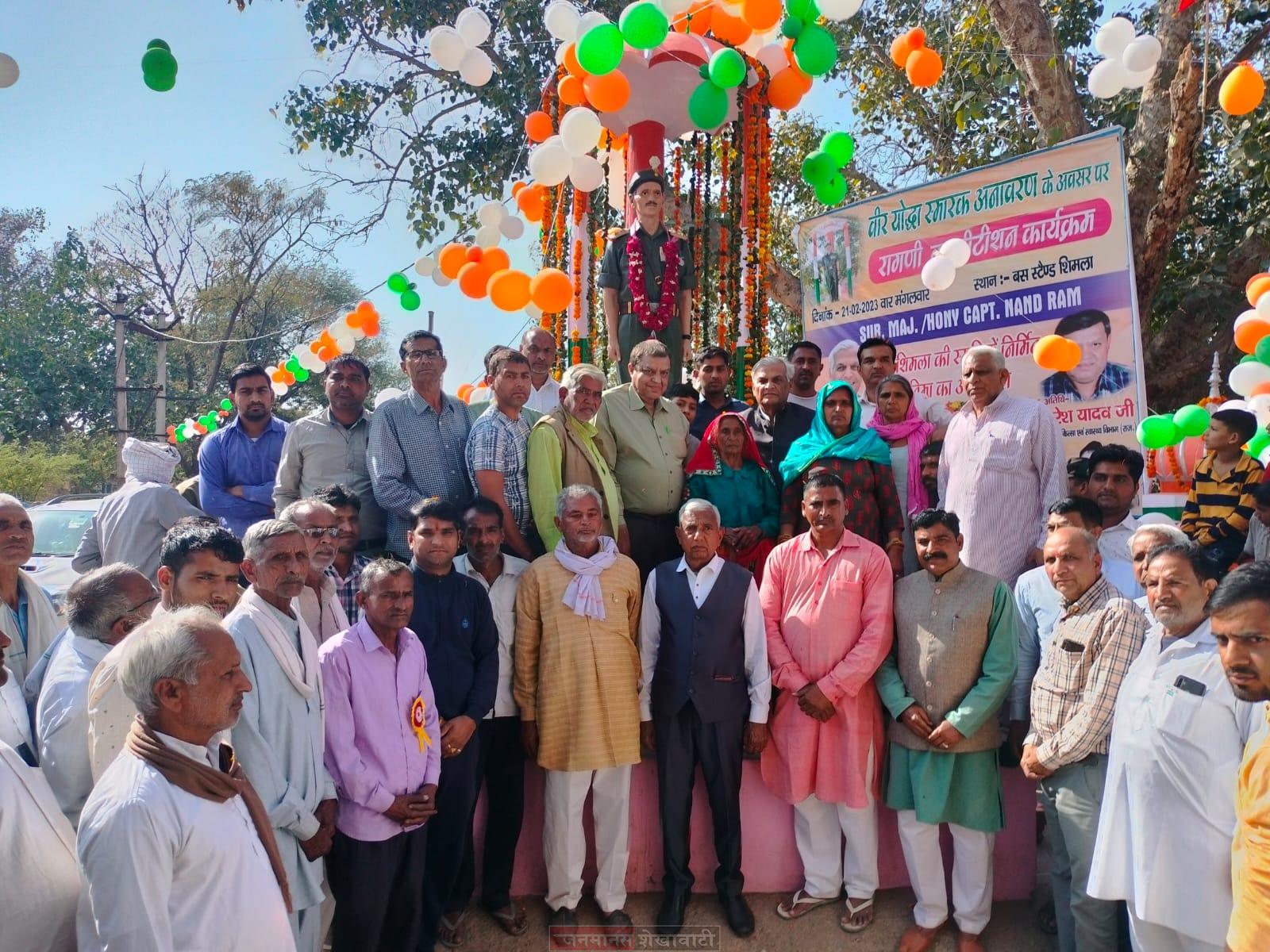 झुंझुनूं-खेतड़ी(शिमला) : शेखावाटी के ऐतिहासिक ग्राम शेरशाह सूरी की जन्म स्थली शिमला में 5 दिसंबर 1934 को शिवलाल यादव के घर धापा देवी की कोख से जन्मे कैप्टन नंदराम यादव कि प्रतिमा का अनावरण 21 फरवरी मंगलवार को दोपहर 2 बजे बस स्टैंड शिमला पर किया गया. समारोह के मुख्य अतिथि मुख्यमंत्री सलाहकार खेतड़ी विधायक डॉ जितेंद्र सिंह थे. समारोह की अध्यक्षता मूर्तिकार मातुराम वर्मा पिलानी ने की. समारोह के विशिष्ट अतिथि डॉ नरेश यादव उप निदेशक चिकित्सा एवं स्वास्थ्य विभाग राजस्थान जयपुर, पूर्व प्रधान मदन लाल गुर्जर, पूर्व ब्लाक अध्यक्ष गोकुल चंद सैनी, जगदीश प्रसाद शर्मा, श्याम सुंदर वर्मा, सूबेदार राकेश कुमार, हवलदार भीमसिंह आदि थे।
