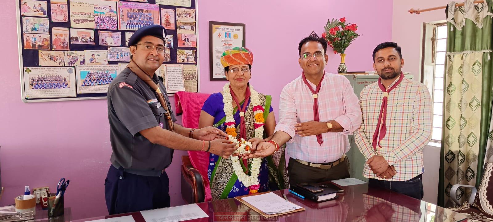 इस अवसर पर सी ओ स्काउट महेश कालावत ने साफा पहनाकर, गाइडर रेना शौनक ने माला एवं स्कार्फ पहनाकर तथा डॉ नवीन ढाका ने पुष्प गुच्छ भेंटकर तथा प्रोग्राम ऑफिसर मनोज कुमार मूण्ड ने स्मृति चिन्ह भेंट कर स्वागत किया।