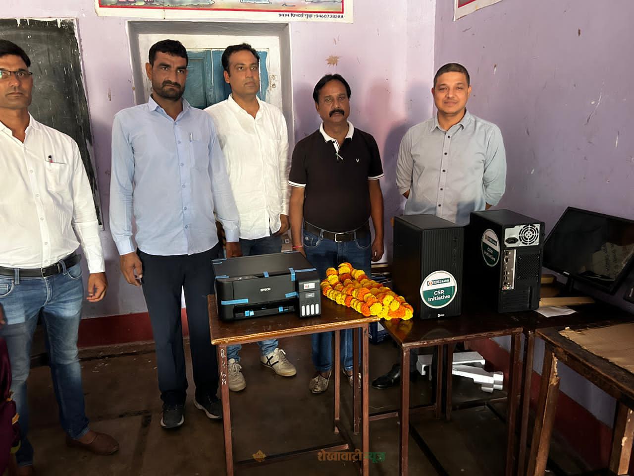 गुढ़ागौड़जी : कॉर्पोरेट सामाजिक दायित्व (CSR) के तहत आईडीबीआई बैंक शाखा टोडी ने राजकीय उच्च माध्यमिक विद्यालय, गुढ़ा गौड़जी को दो कंप्यूटर और एक प्रिंटर भेंट कर सराहनीय पहल की है। बैंक शाखा प्रबंधक रवि आचार्य एवं दिलीप सिंह ने विद्यालय पहुंचकर उपकरणों का वितरण किया। इस अवसर पर विद्यालय के प्रधानाचार्य रणजीत सिंह, स्टॉक प्रभारी मुकेश कुमार बुडानिया, मनोज कुमार गिल और संजय कुमार ने अतिथियों का पारंपरिक रूप से साफा व माल्यार्पण कर स्वागत और अभिनंदन किया।