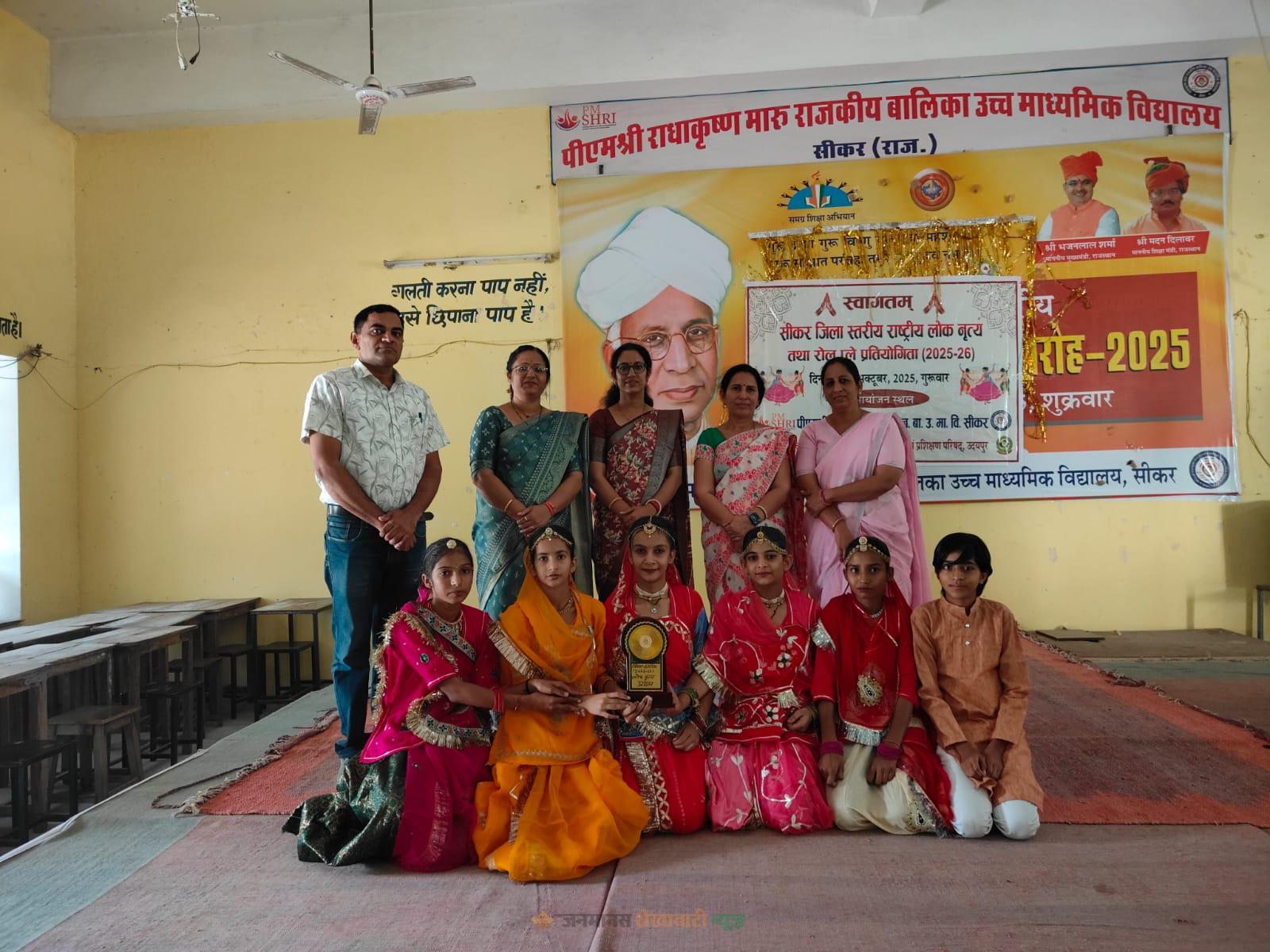 सीकर : जिला स्तरीय रोल प्ले और लोक नृत्य प्रतियोगिता पीएम श्री राधा कृष्ण मारू उच्च माध्यमिक विद्यालय में संपन्न हुई । शिक्षा विभाग द्वारा कक्षा 8 एवं 9 के बालक और बालिकाओं के लिए लोक नृत्य प्रतियोगिता हर वर्ष आयोजित की जाती है। जिसमें अलग-अलग थीम होती हैं। इस बार 11 अलग-अलग थीम राजस्थानी लोक नृत्य प्रतियोगिता में शामिल थे। राजकीय उच्च प्राथमिक विद्यालय उजीन सिंह का नाडा बेरी के विद्यार्थियों ने लगातार दूसरी बार जिले में प्रथम स्थान प्राप्त किया। प्रधानाध्यापक राज कमल जाखड़ ने बताया कि अब आगे राज्य स्तरीय प्रतियोगिता में जिले का प्रतिनिधित्व स्थानीय विद्यालय के विद्यार्थी करेंगे। इस अवसर पर डाइट प्रधानाचार्य किरण सैनी, मारु स्कूल के प्रधानाचार्य दिनेश पुरोहित, प्रवीण शर्मा,ललिता शर्मा, केसाराम धायल, लक्ष्मी शर्मा ने विद्यार्थियों को प्रशस्ति पत्र और ट्रॉफी प्रदान की।