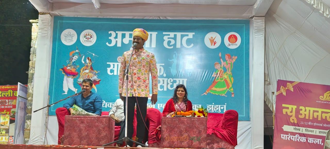 झुंझुनूं : जिला मुख्यालय के शहीद परमवीर पीरू सिंह राजकीय उच्च माध्यमिक विद्यालय के खेल ग्राउंड में चल रहे अमृता हाट में शनिवार को कवि सम्मेलन के दौरान विख्यात कवियों ने अपनी रचनाएं प्रस्तुत की। कवि सम्मेलन में केशरदेव मारवाड़ी, डॉ शुभम त्यागी, हरीश हिंदुस्तानी, जिला जनसंपर्क अधिकारी हिमांशु सिंह इस्लामपुर के हनान ने अपनी रचनाएं पेश की।