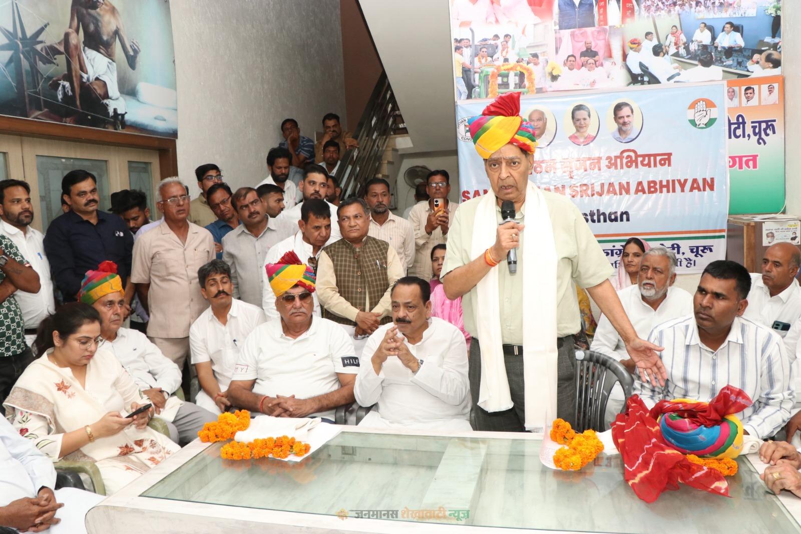 चूरू : जिला मुख्यालय पर चूरू शहर व देहात ब्लॉक कांग्रेस कमेटी के तत्वावधान में शहर व देहात ब्लॉक कांग्रेस कार्यालय मंडेलिया हाउस चूरू में कांग्रेस के संगठन सर्जन अभियान के तहत आयोजित हुई बैठक में ऑल इंडिया कांग्रेस कमेटी प्रभारी सुभाष चौपडा ने कार्यकर्ताओं से परिचर्चा की। उन्होने कहा कि हमारे नेता राष्ट्रीय अध्यक्ष मल्लिकार्जुन खडगे व नेता राहुल गांधी ने यह अभियान कार्यकर्ताओं के सम्मान और एकजुट होकर कार्य किए जाने के लिए ही चलाया है। प्रभारी सुभाष चौपडा ने कहा कि कार्यकर्ताओं की राय और उनकी भावनाएं जानने के लिए उन्हे आपके बीच भेजा है। चौपडा ने कहा कि भाजपा देश मे नफरत फैलाकर भाईचारा खत्म करना चाहती है जो देश की जनता कभी नही करने देगी। बैठक में कार्यकर्ताओं ने चूरू विधानसभा क्षेत्र की राय के लिए एकजूट होकर राजस्थान प्रदेश कांग्रेस कमेटी उपाध्यक्ष रफीक मंडेलिया को अधिकृत किया इस पत्र का वाचन पूर्व उप जिला प्रमुख सोहन मेघवाल ने किया। रफीक मंडेलिया ने कहा कि अधिकृत करने के उपरांत भी आप प्रभारी से व्यक्तिगत तौर पर मिलकर अपनी राय दे सकते है। उन्होने कहा कि पार्टी आलाकमान का फैसला होगा वो हमें स्वीकार्य है।