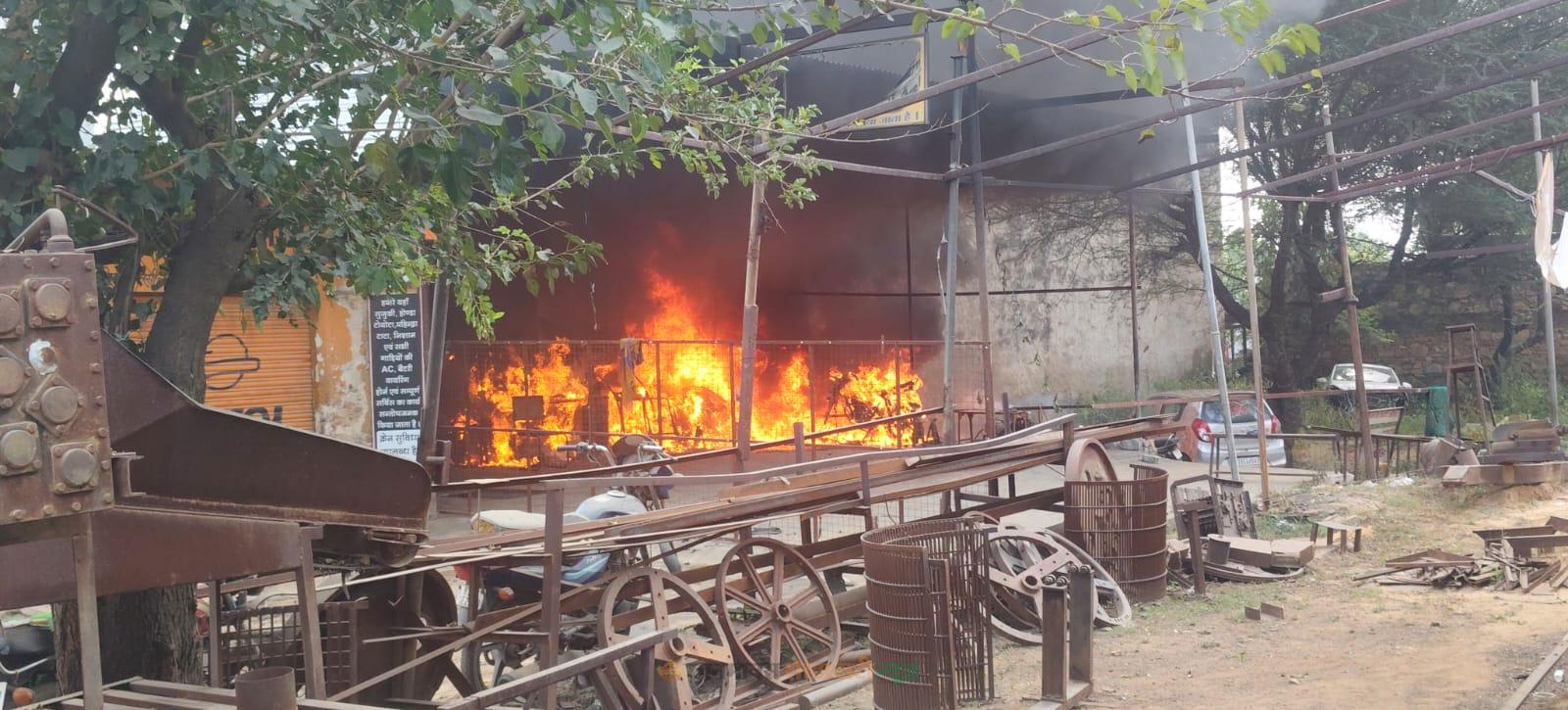 बाइक सर्विस सेंटर के बाहर लगी भीषण आग, बाइक और कार जलकर राख