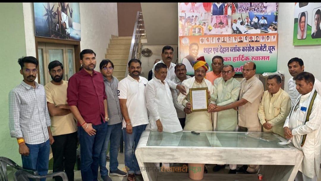 चूरू कांग्रेस के वरिष्ठ नेता हनुमान कोठारी द्वारा अपने प्रतिनिधियों के माध्यम से सम्मान किया गया