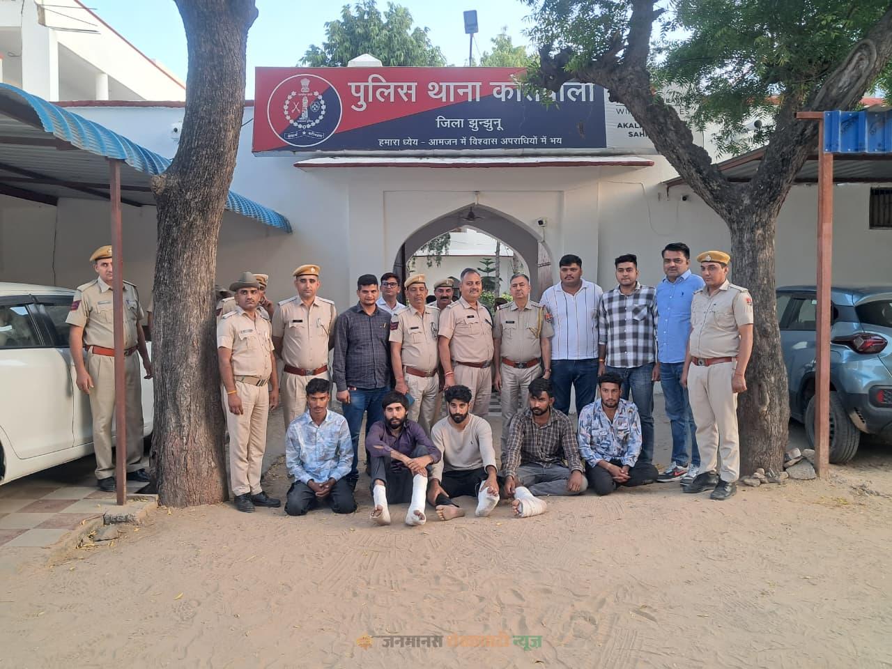 गिरफ्तार आरोपी: कपिल कुमार कस्वां (29) निवासी नयासर, झुंझुनूं, पंकज कुमार (21) निवासी पिपराली, सीकर, राहुल उर्फ राज (21) निवासी रामगढ़ सेठान, सीकर, अजय उर्फ अजु (22) निवासी खिरोड़, झुंझुनूं, ताराचंद उर्फ टीसी (21) निवासी पिपराली, सीकर इन सभी को भारतीय न्याय संहिता की विभिन्न धाराओं सहित SC/ST Act के तहत गिरफ्तार किया गया।