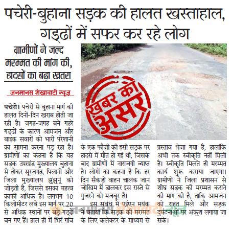 यह सड़क पचेरी कलां, भिर्र, बड़बर, बडोली और आसपास के कई गांवों को बुहाना, सूरजगढ़, पिलानी व झुंझुनूं से जोड़ती है। पिछले कई महीनों से सड़क पर जगह-जगह गहरे गड्ढे बने हुए थे। बरसात में हालत और भी बिगड़ गई थी। राहगीरों को झटके खाते हुए निकलना पड़ता था। स्कूल जाने वाले बच्चों और बस चालकों को रोज़ाना परेशानी उठानी पड़ रही थी।