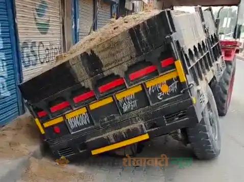 नीमकाथाना में बजरी ट्रॉली सड़क में धंसी:शाहपुरा रोड पर हादसा टला, क्रेन से बाहर निकाली