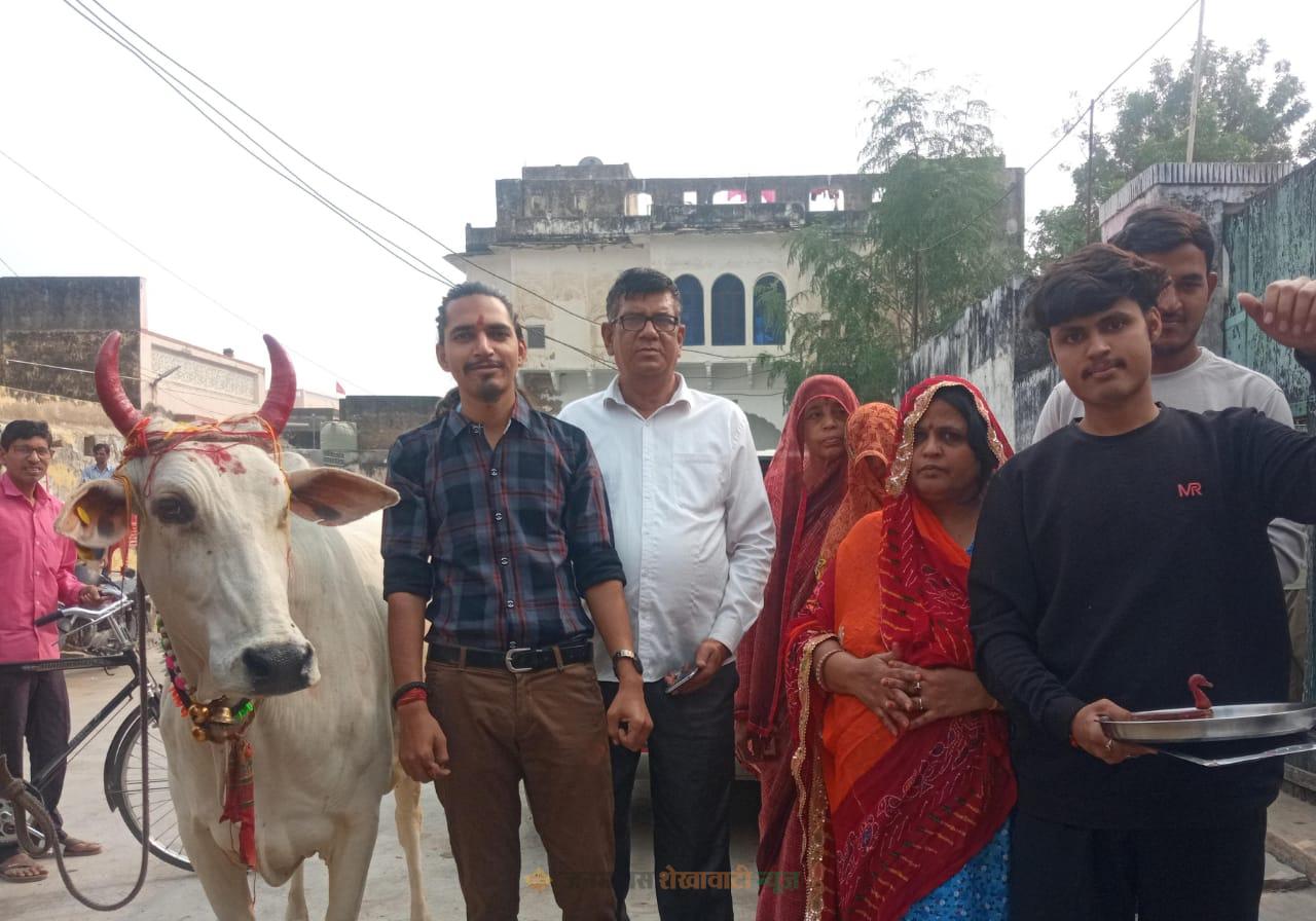 बिसाऊ : गोपाष्टमी के पावन पर्व पर वार्ड नं. 20 में गौ पूजन हुआ। वार्डवासियों ने गौमाता की आरती की और गौमाता को गुड़, दलिया, फल एवं अनेक व्यंजन खिलाए। वार्ड के युवा नेता गौरव माटोलिया ने बताया कि गाय को भारतीय संस्कृति में माता माना जाता है तथा गाय की सेवा करने से पुण्य की प्राप्ति होती है। रामप्रकाश हरितवाल द्वारा गौमाता की जय के जयकारे लगवाए गए तथा हर वर्ष की भाँति स्व. ओमप्रकाश जी पुजारी के परिवार द्वारा गौ सेवकों को भोजन करवाया गया। इस अवसर पर रामप्रकाश हरितवाल, गौरव माटोलिया, दीनदयाल, आयूष माटोलिया, अजय, अदिति, सोनू, प्रिंस, अंशु, मंगतुराम, रामस्वरुप, विजय एवं अनेक गौ भक्त उपस्थित थे।