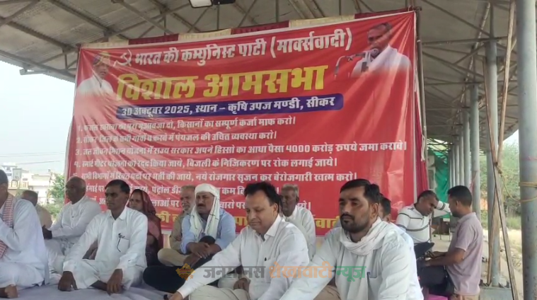 सीकर : स्मार्ट मीटर योजना को रद्द करने और किसानों सहित आमजन से जुड़ी विभिन्न मांगों को लेकर भारत की कम्युनिस्ट पार्टी (मार्क्सवादी) की ओर से शुक्रवार को कृषि उपज मंडी परिसर में आमसभा का आयोजन किया गया। सभा में मुख्य रूप से सांसद अमराराम मौजूद रहे, जबकि उनके साथ पूर्व विधायक पेमाराम, ग्रामीण प्रतिनिधि और बड़ी संख्या में माकपा कार्यकर्ता एवं किसान शामिल हुए।