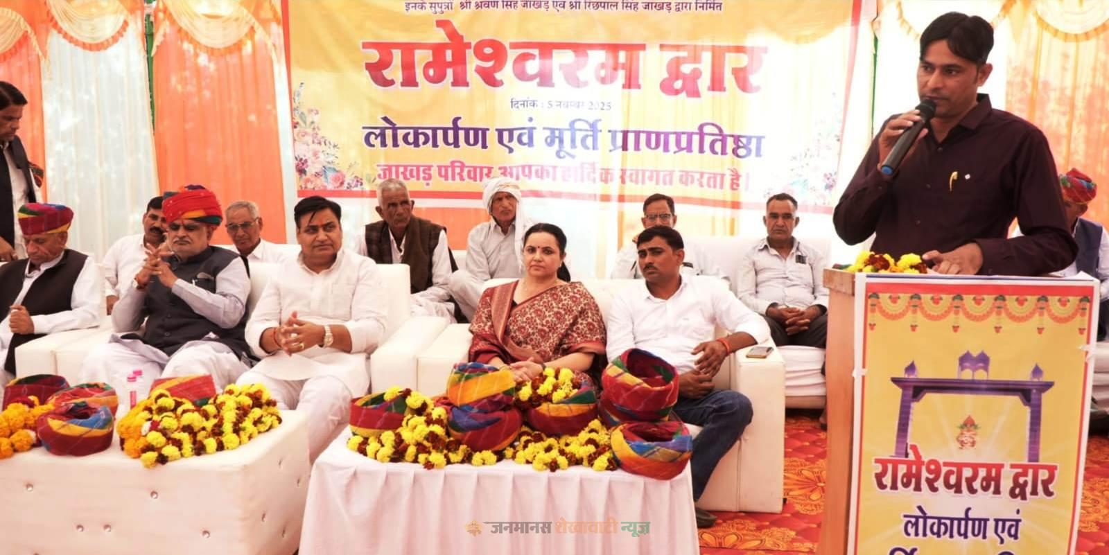 नेछवा : नेछवा के स्वामी ढाणी में बुधवार को धार्मिक और भावनात्मक माहौल के बीच रामेश्वरम द्वार का लोकार्पण एवं स्व. सोनी देवी की मूर्ति की प्राण प्रतिष्ठा समारोहपूर्वक आयोजित हुई। यह आयोजन स्व. सोनी देवी की पुण्य स्मृति में उनके पुत्रों श्रवण सिंह जाखड़ व रिछपाल सिंह जाखड़ द्वारा कराया गया।