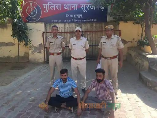 सूरजगढ़ : सूरजगढ़ क्षेत्र के ग्राम चौराड़ी अगुणी में होटल में घुसकर मारपीट, तोड़फोड़ और मंथली मांगने के मामले में पुलिस ने बड़ी कार्रवाई करते हुए दो और आरोपियों को गिरफ्तार कर लिया है। गिरफ्तार आरोपियों से घटना में प्रयुक्त गाड़ी और बाइक भी जब्त की गई है। थानाधिकारी धर्मेंद्र कुमार मीणा के नेतृत्व में गठित विशेष टीम ने त्वरित कार्रवाई करते हुए आरोपियों सोनू सिंह,निवासी लोटिया और प्रदीप सिंह उर्फ पलिया,निवासी चौराड़ी अगुणी को गिरफ्तार किया है।