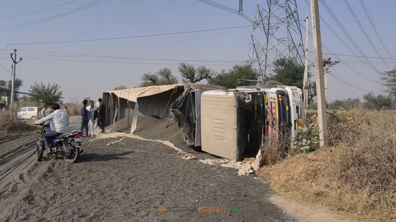 रसूलपुर के पास में टायर फटने से डस्ट से भरा ट्रोला पलटा, ड्राइवर ओर खलाशी घायल
