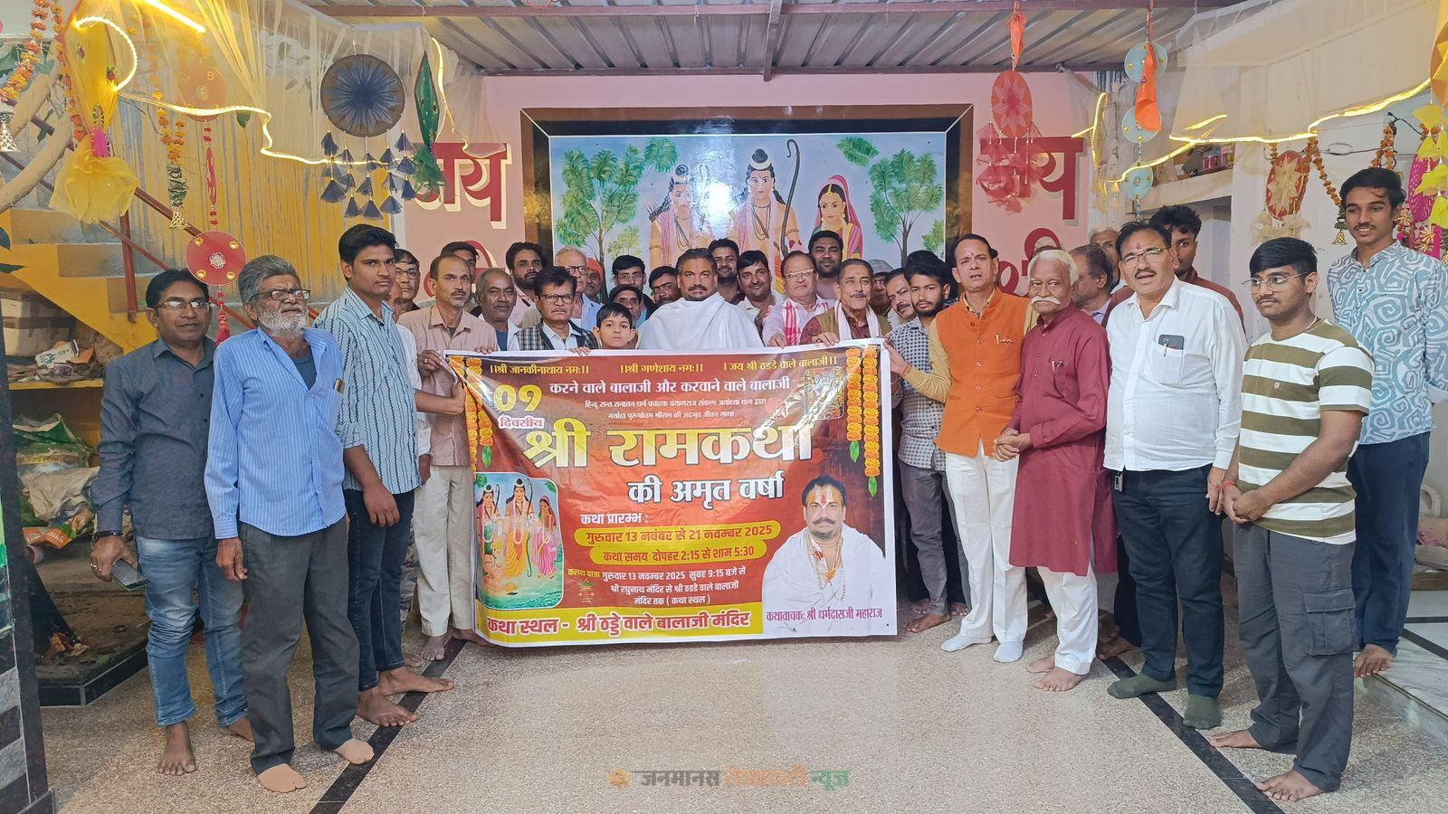 मुकुंदगढ़ : शहर में स्थित श्री ठड्डे वाले बालाजी मंदिर परिसर में 13 नवंबर गुरुवार से प्रारंभ होने वाली नौ दिवसीय श्री राम कथा व कलश यात्रा के पोस्टर का विमोचन हुआ। पुजारी सुभाष शर्मा ने बताया कि पुनीत कार्यक्रम के पोस्टर का विमोचन श्री ठड्डे वाले बालाजी मंदिर परिसर में सोमवार शाम कथा वाचक महंत धर्मदास महाराज व बाल हनुमान के कर कमलों से किया गया। इस अवसर पर आत्माराम जोशी, रामस्वरूप बियाला, गोविंद शर्मा, मनोज सुरोलिया, घनश्याम शर्मा, बसन्त घोडेला, राजेंद्र भार्गव, नरेंद्र योगी, शरद जोशी, ओमप्रकाश चोटिया, दीपक टेलर, दिलीप चेजारा, मुकेश चेजारा, नरेंद्र कुमावत, अंकित शर्मा, कृष्ण कुमावत, भास्कर दुलर, संतोष शर्मा, बुधराम सैनी, मनीष शर्मा, कुलदीप सांखला सहित सैकड़ो भक्तगण मौजूद थे।
