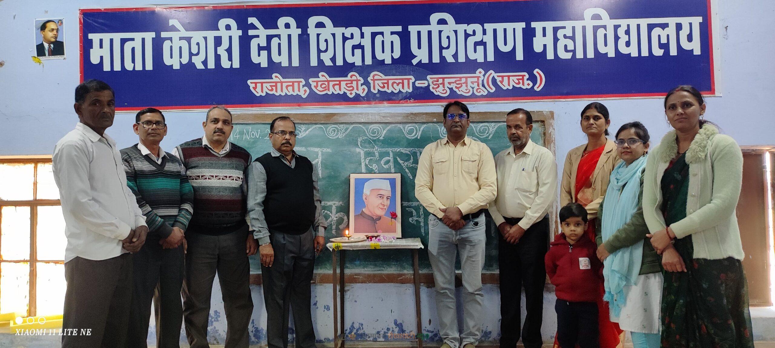 खेतड़ी : खेतड़ी विकास समिति द्वारा संचालित माता केशरी देवी शिक्षक प्रशिक्षण महाविद्यालय, राजोता में गुरुवार को स्वतंत्र भारत के प्रथम प्रधानमंत्री पंडित जवाहरलाल नेहरू की जयंती एवं बाल दिवस उत्साहपूर्वक मनाया गया। कार्यक्रम में महाविद्यालय के सभी स्टाफ सदस्य और प्रशिक्षणार्थी उपस्थित रहे।