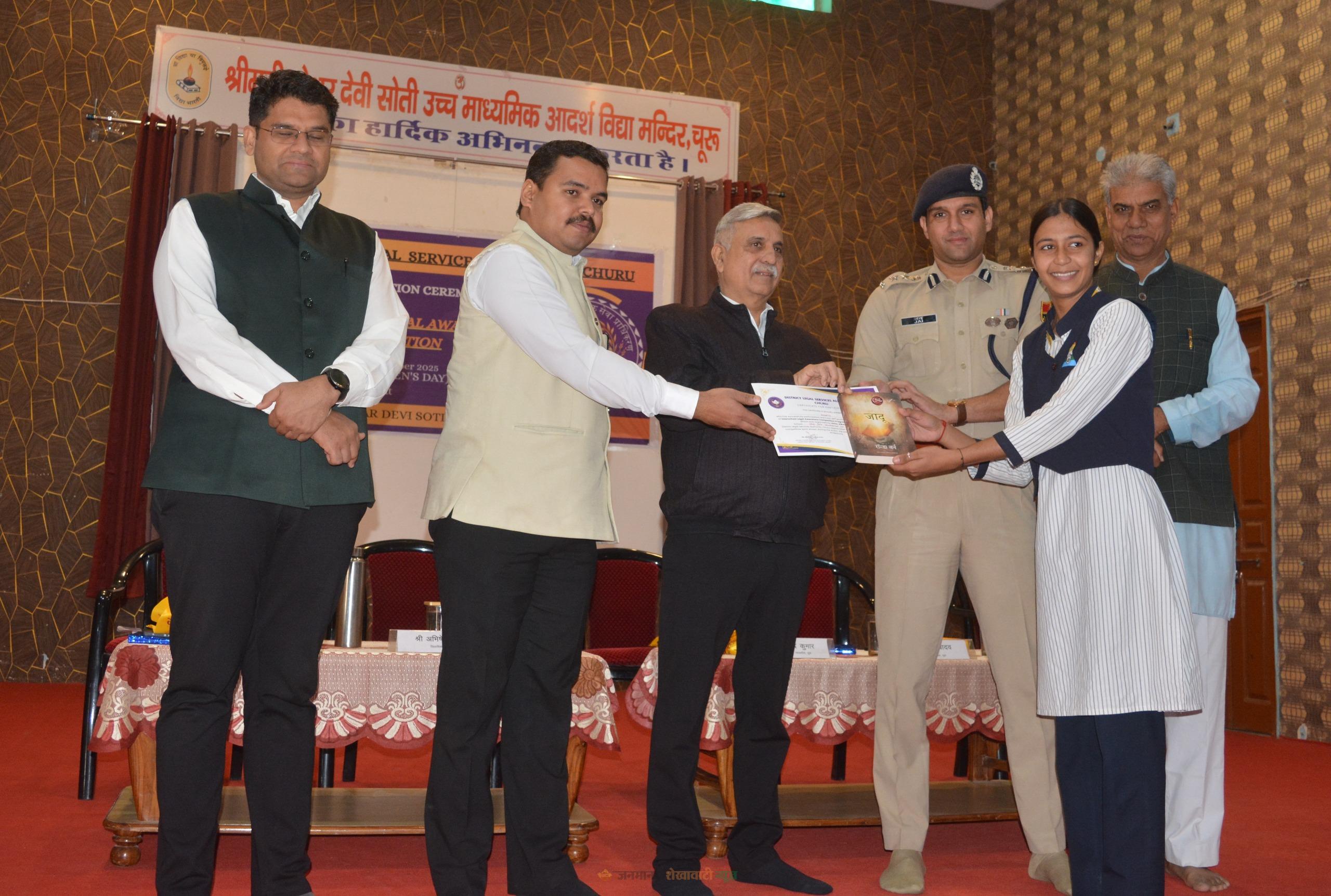 चूरू : राष्ट्रीय बाल दिवस के अवसर पर शुक्रवार को जिला मुख्यालय स्थित श्रीमती केशर देवी सोती सीनियर सेकंडरी स्कूल में जिला विधिक सेवा प्राधिकरण द्वारा पुरस्कार वितरण समारोह आयोजित किया गया। कार्यक्रम में जिला एवं सत्र न्यायाधीश एवं प्राधिकरण अध्यक्ष रविन्द्र कुमार, जिला कलक्टर अभिषेक सुराणा, पुलिस अधीक्षक जय यादव, सचिव डॉ. शरद कुमार व्यास, पोक्सो न्यायाधीश अनिल गुप्ता, एससी/एसटी न्यायाधीश योगिता पारीक, एडीजे राजेंद्र चौधरी, सीजेएम हरीश कुमार, जेएम शिवानी सहित अन्य न्यायिक अधिकारियों ने शिरकत की।
