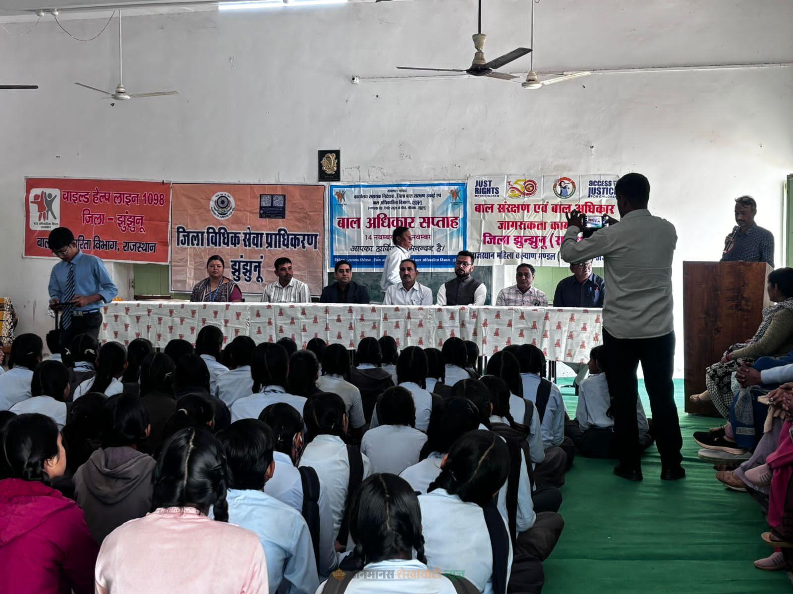 झुंझुनूं : बच्चों के अधिकारों और सुरक्षा को लेकर जागरूकता फैलाने के लिए बाल अधिकारिता विभाग ने शुक्रवार को महात्मा गांधी राजकीय उच्च माध्यमिक विद्यालय, इण्डाली में बाल अधिकार सप्ताह की शुरुआत की। कार्यक्रम में बच्चों को उनके अधिकारों, कर्तव्यों और सुरक्षा से जुड़े कानूनों की जानकारी दी गई। बाल श्रम, बाल विवाह और शोषण रोकने के लिए समाज से सामूहिक प्रयास का आह्वान किया गया।