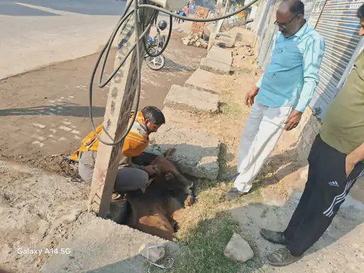 सिंघाना में खुले नाले में गिरा बछड़ा:कामधेनु सेना के कार्यकर्ताओं ने किया रेस्क्यू, व्यापारी बोले- सफाई के बाद नहीं लगाया चैंबर