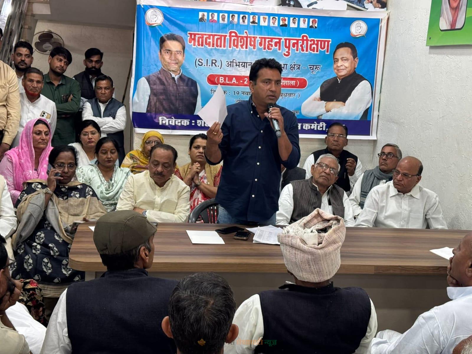 चूरू : जिला मुख्यालय स्थित शहर व देहात ब्लॉक कांग्रेस कार्यालय मंडेलिया हाउस में निर्वाचन विभाग की प्रक्रिया एसआईआर को लेकर चूरू विधानसभा क्षेत्र के बीएलए व कांग्रेस कार्यकर्ताओं की बैठक आयोजित की गई। बैठक में चूरू विधानसभा क्षेत्र के बीएलए व कांग्रेस कार्यकर्ताओं को एसआईआर को लेकर प्रशिक्षण दिया गया। बैठक में मुख्य वक्ता चूरू लोकसभा सांसद राहुल कस्वां, एआईसीसी सचिव रिहाना रियाज चिस्ती, पीसीसी उपाध्यक्ष रफीक मंडेलिया, चूरू विधानसभा प्रभारी भीमराज जाखड उपस्थित रहें। बैठक में सांसद कस्वा ने चूरू विधानसभा क्षेत्र के बीएलए व कांग्रेस कार्यकर्ताओं की आवश्यक बैठक में वन-टू-वन मिलकर सभी से पुरा फीडबैक लिया और एसआईआर में आ रही अनेक समस्याओं पर विस्तार पूर्वक बताते हुए कहा कि सभी बीएलए व कांग्रेस कार्यकर्ताओं को घर घर जाकर निर्वाचन आयोग द्वारा अधिकृत बीएलओ के साथ रहकर मतदाताओं के गणना प्रपत्र भरने में सहयोग करने का आह्वान किया।