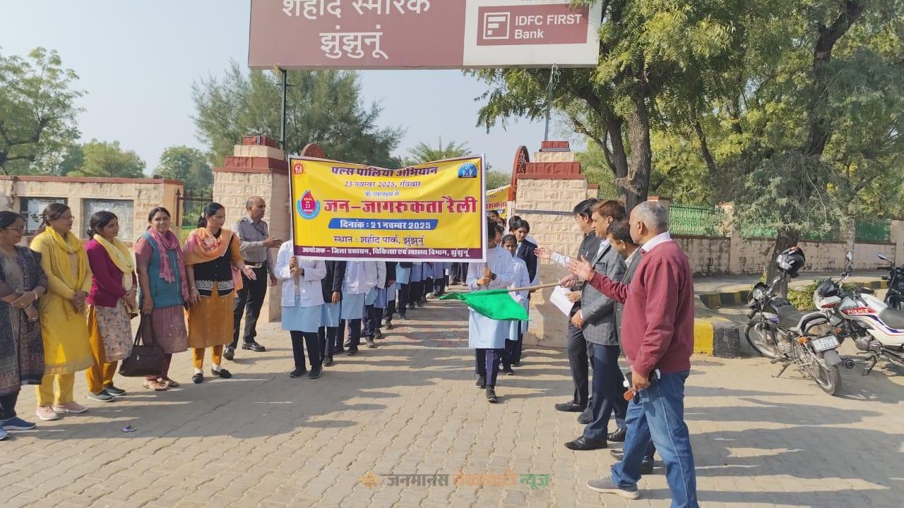 झुंझुनूं : पल्स पोलियो अभियान को सफल बनाने के लिए शुक्रवार को नर्सिंग स्टूडेंट्स द्वारा जागरूकता रैली निकाली गई। जिला कलक्टर डॉ. अरुण गर्ग ने शहीद पार्क से रैली को हरी झंडी दिखाकर रवाना किया। रैली रोड नम्बर 1, रोडवेज बस डिपो होते हुए जेपी जानू स्कूल पहुंचकर सम्पन्न हुई।
