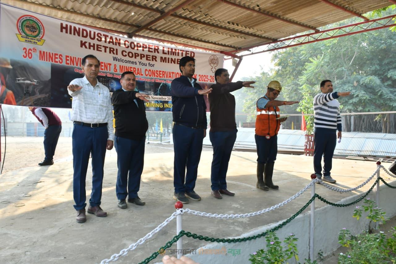खेतड़ी नगर : केसीसी प्रोजेक्ट के सर्विस शाफ्ट मैदान में शनिवार को भारतीय खान ब्यूरो, अजमेर रीजन के तत्वावधान में 36वें खान पर्यावरण एवं खनिज संरक्षण सप्ताह का विधिवत शुभारंभ हुआ। कार्यक्रम के मुख्य अतिथि खेतड़ी खदान प्रमुख जगदीश सिंह सोढा ने ध्वजारोहण कर सप्ताह की शुरुआत की। मुख्य अतिथि सोढा ने कहा कि खनन क्षेत्र में पर्यावरण सुरक्षा सर्वोच्च प्राथमिकता होनी चाहिए। डिजिटाइजेशन से खनन गतिविधियों में पारदर्शिता, सुरक्षा और पर्यावरणीय निगरानी में तेजी आई है। उन्होंने कहा कि खान पर्यावरण संरक्षण केवल एक सप्ताह भर का आयोजन नहीं, बल्कि इसे दैनिक कार्यप्रणाली का हिस्सा बनाना आवश्यक है।