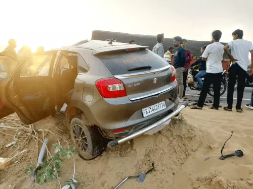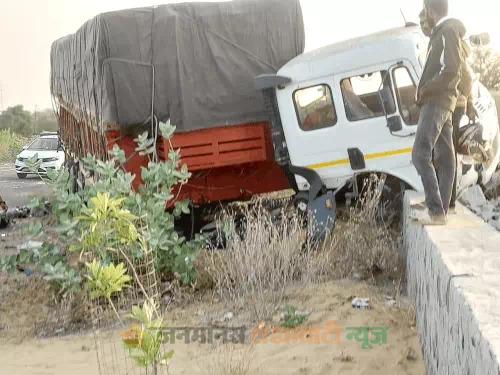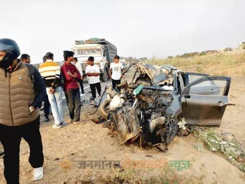 एनएच-11 पर नयासर के पास हादसा:ओवरटेक में कार-ट्रक भिड़े, बैलेंनो के उड़े परखच्चे, चालक गंभीर घायल