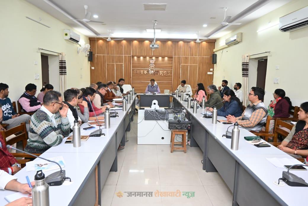 झुंझुनूं : जिला कलक्टर डाॅ. अरूण गर्ग ने बुधवार को जिला स्तरीय मासिक समीक्षा बैठक में विभिन्न विभागों के जिला स्तरीय अधिकारियों को उनके विभाग से संबंधित योजनाओं से लोगों को लाभान्वित करने एवं उनमें प्रगति लाने के निर्देश दिए। उन्होंने आगामी माह में राज्य सरकार के 2 वर्ष के कार्यकाल पूर्ण होने के अवसर पर जिला स्तर पर प्रकाशित होने वाली जिला दर्शन पुस्तिका के लिए विभागीय उपलब्धियां भिजवाने के भी निर्देश दिए। उन्होंने राजस्थान सम्पर्क पोर्टल पर लम्बित प्रकरणों पर चर्चा करते हुए संबंधित अधिकारियों से कहा कि वे अपने विभाग के लम्बित प्रकरणों का त्वरित निस्तारण कर आमजन को लाभ दिलवाएं।