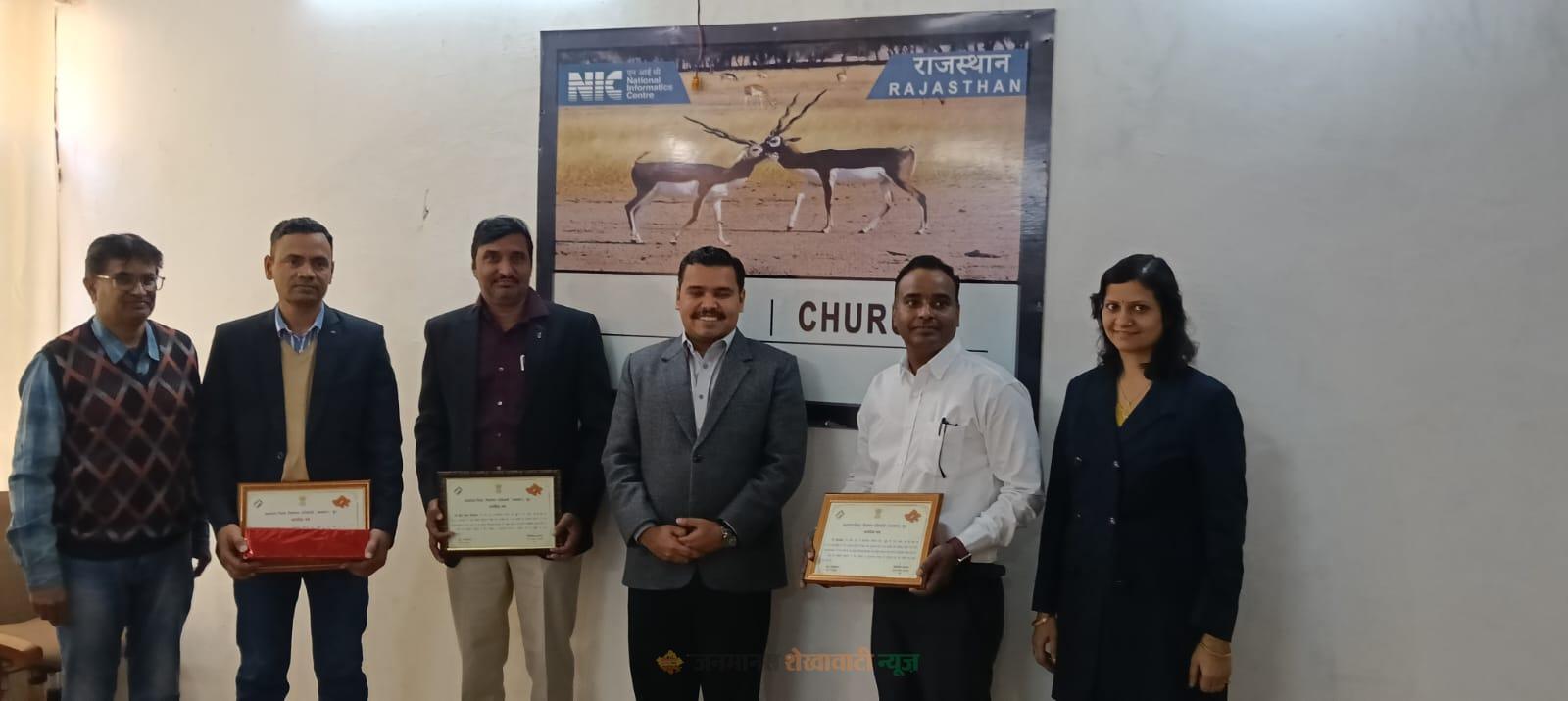 चूरू : जिला निर्वाचन अधिकारी अभिषेक सुराणा ने गुरुवार को जिला कलक्टर कार्यालय में एसआईआर-2026 अंतर्गत शत प्रतिशत डिजीटाइजेशन कार्य करने वाले सुपरवाइजरों को सम्मानित किया। जिला निर्वाचन अधिकारी सुराणा ने चूरू विधानसभा क्षेत्र के सुपरवाइजर के महेश कुमार, रामकिशन, फूलाराम को शत-प्रतिशत डिजीटाइजेशन कार्य के लिए प्रशस्ति-पत्र प्रदान कर सम्मानित किया। इस दौरान सभी सुपरवाइजरों ने फील्ड में कार्य के दौरान अनुभवों, कार्ययोजना की जानकारी दी।