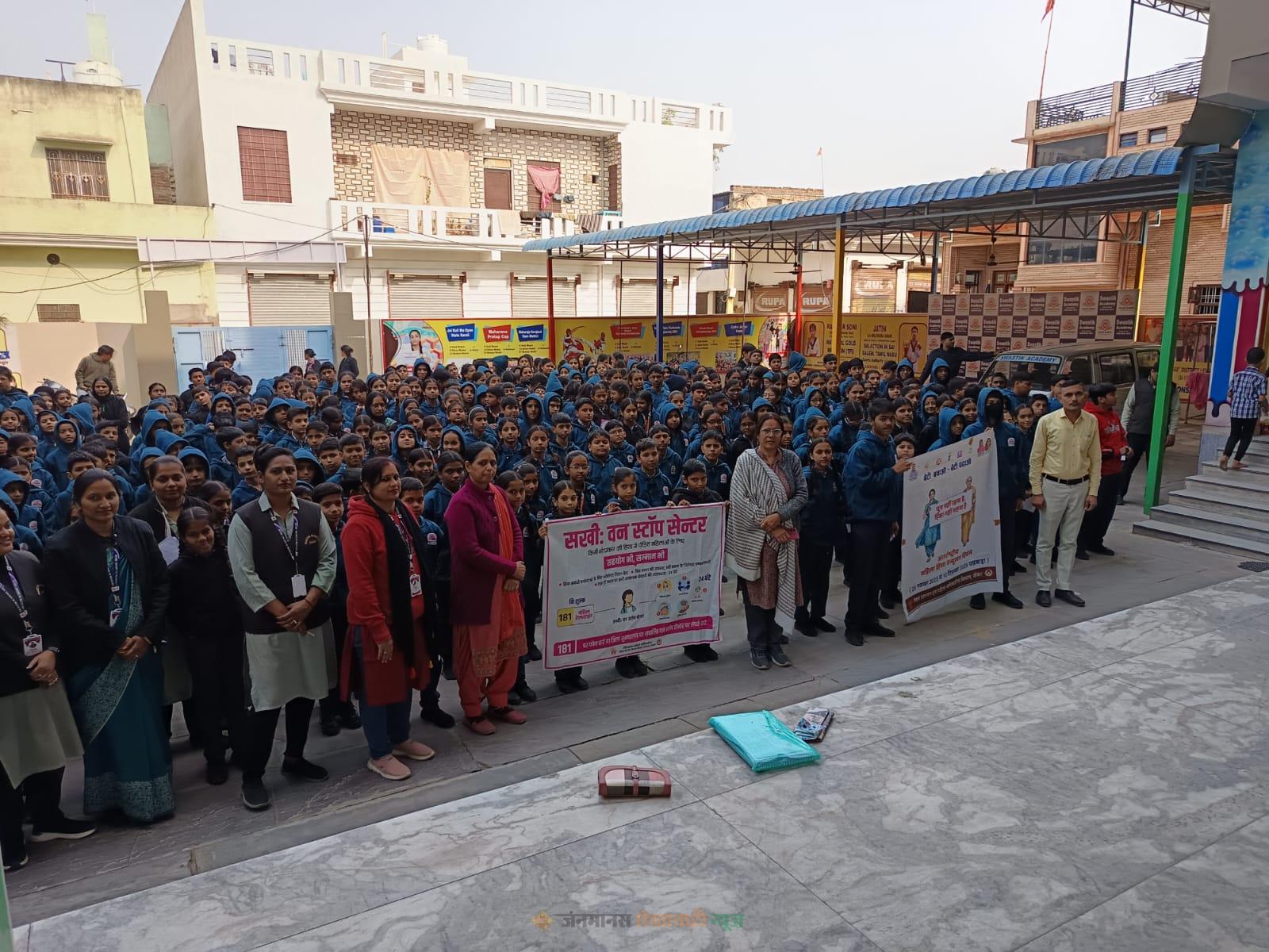 कार्यक्रम में छात्राओं को सुरक्षा, सहायताओं और अधिकारों के प्रति जागरूक किया गया। अंत में सभी ने अपने समुदाय में महिला हिंसा रोकने का संकल्प लिया। स्कूल संचालक उषा कुमावत सहित स्टाफ व छात्र-छात्राएँ उपस्थित रहे।