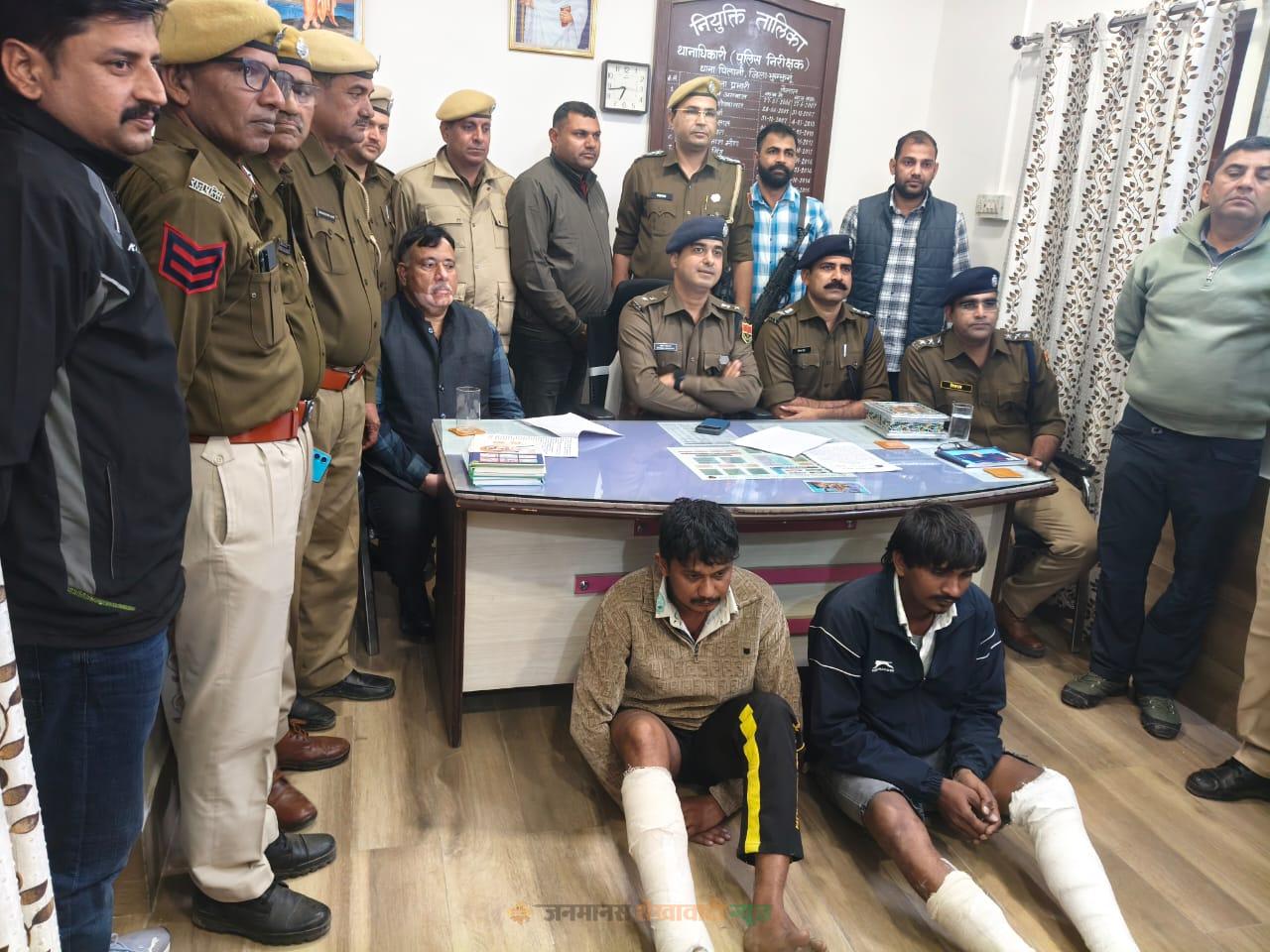 पिलानी : झुंझुनूं पुलिस ने पिलानी थाना क्षेत्र के लीखवा गांव में शराब ठेके पर हुई फायरिंग की वारदात का खुलासा किया है। इस मामले में 25-25 हजार रुपए के इनामी दो मुख्य आरोपियों को गिरफ्तार किया गया है। झुंझुनूं एसपी बृजेश उपाध्याय ने प्रेस कॉन्फ्रेंस में यह जानकारी दी।