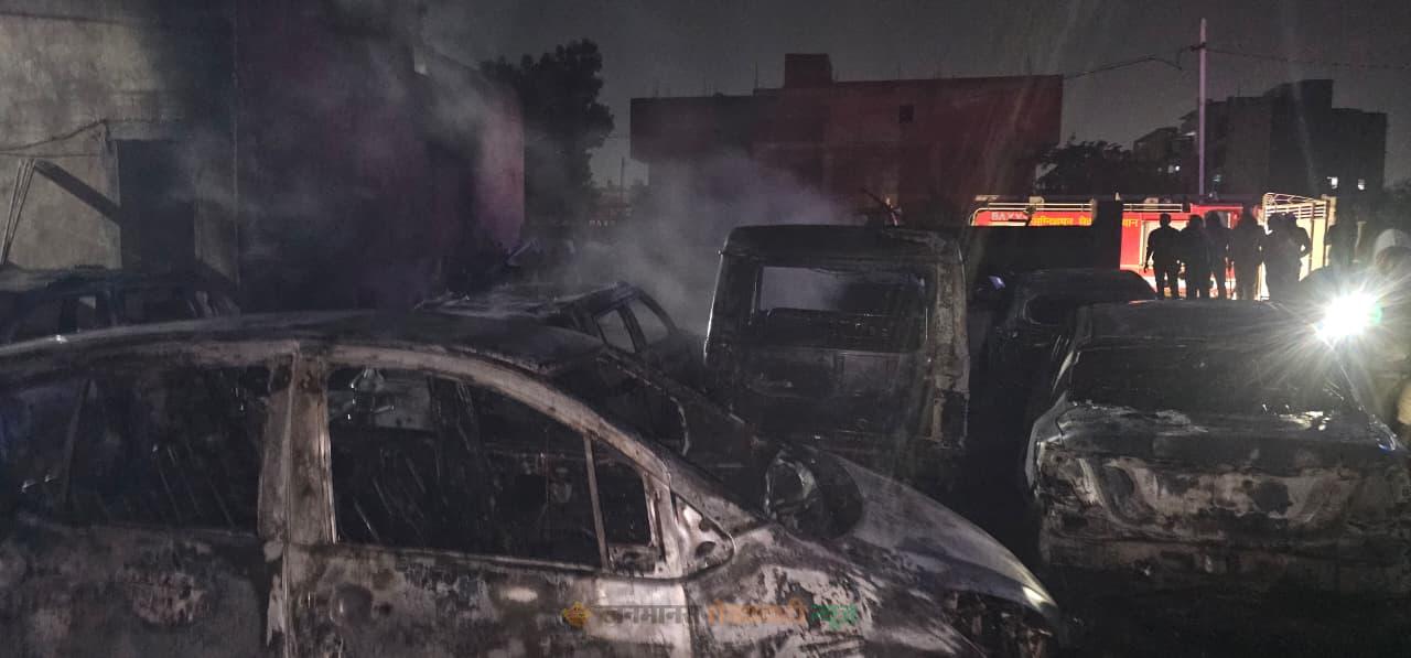 पेट्रोल डालकर वर्कशॉप में लगाई आग, 18 कारें जलकर खाक:5 दिन पहले की थी तोड़फोड़, शिकायत के बाद भी नहीं हुई कार्रवाई