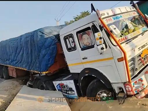 रामगढ़ बाईपास पर बेकाबू ट्रक नाला तोड़कर फंसा:देर रात पुलिस चौकी के पास हुआ हादसा, कोई हताहत नहीं