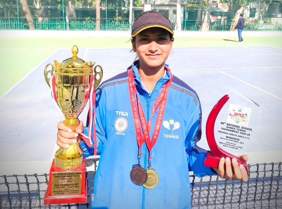 सरदारशहर : मेयो कॉलेज गर्ल्स स्कूल, अजमेर मे 69 वें स्कूल गेम्स फेडरेशन ऑफ इंडिया (एस जी एफ आई) नेशनल टेनिस गर्ल्स टूर्नामेंट (अंडर 17) की एकल प्रतियोगिता में शानदार प्रदर्शन करते हुए राजस्थान की ही जहान्वी काजला को हरा कर स्वर्ण पदक जीता । पूरे देश के अलग राज्यों एवं केंद्र शासित प्रदेशों व बॉर्ड्स की टीम एवं कुल 109 खिलाड़ी इस प्रतियोगिता में भाग लेने अजमेर आये थे।